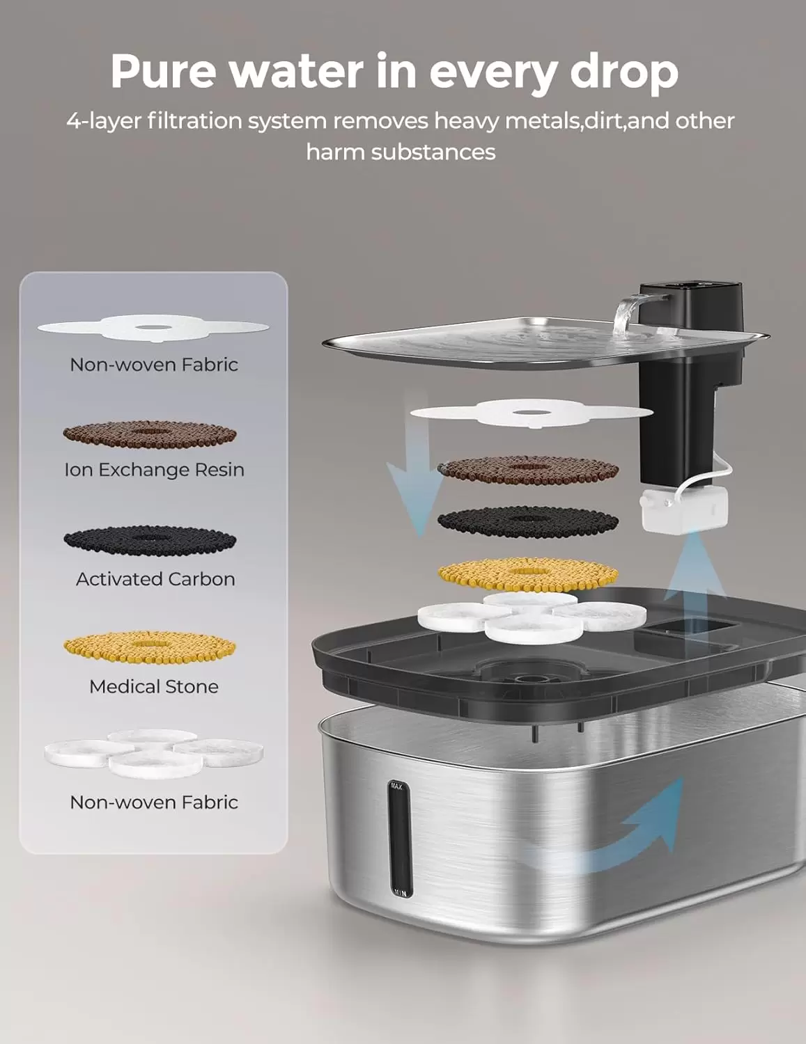 Higiene Total: Acero Inoxidable SUS 304 de grado médico, resistente al óxido y apto para lavavajillas, manteniendo la pureza del agua al 99.9%.