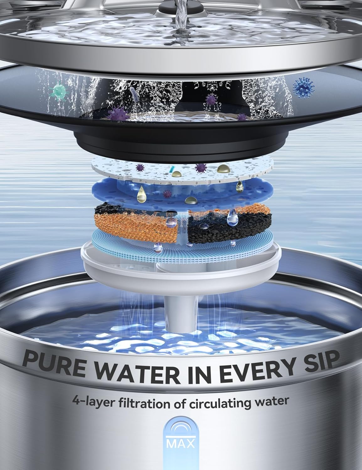 Sistema vertical de filtración y circulación: Cada gota de agua se somete a filtración de múltiples capas: carbón activado para la eliminación de olores, resina de intercambio iónico para suavizar y eliminar metales pesados, tela no tejida para capturar cabello e impurezas, y esponja de bomba de alta densidad para eliminar partículas finas. Esto garantiza un suministro de agua fresca y saludable durante todo el año para su mascota. Recomendamos reemplazar el filtro cada 2 semanas para la salud de la mascota (busca filtros oficiales “B0D1K826GX”