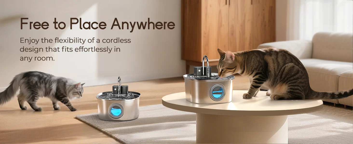 Libertad inalámbrica para tu mascota: disfruta de la comodidad de una fuente de agua para gatos verdaderamente inalámbrica, lo que te permite colocarla donde tu mascota prefiera beber. Ya sea en la sala de estar, cocina o incluso al aire libre, el diseño inalámbrico elimina el riesgo de que tu mascota mastique cables peligrosos y ofrece una mayor flexibilidad en tu hogar.