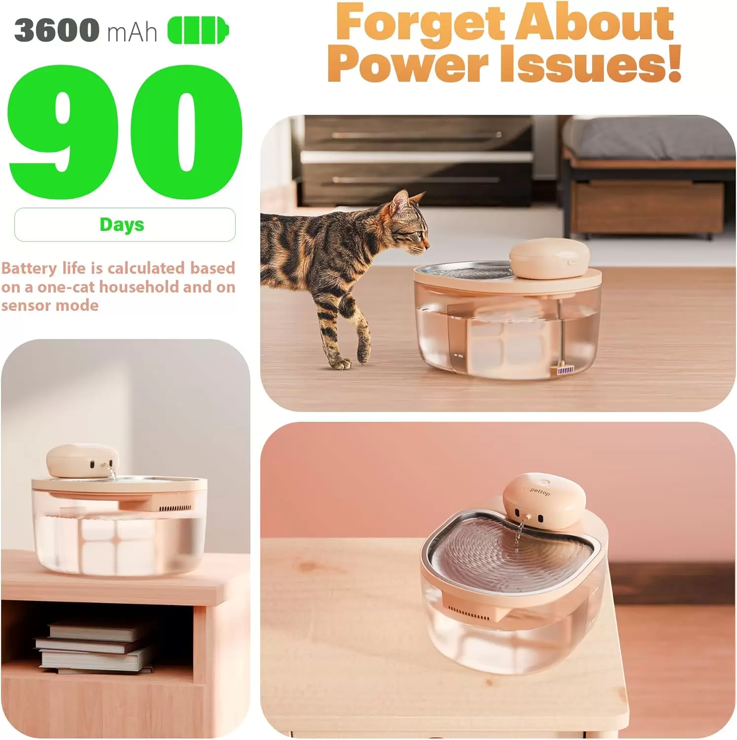 Sin cables, sin interrupciones, sin mordeduras: alimentada por una batería de litio de 3600 mAh, la fuente para mascotas se carga completamente en solo 6 horas y dura hasta 90 días en modo sensor y 70 días en modo temporizador, asegurando que el agua dulce siempre esté disponible, incluso durante cortes de energía o sin la molestia de los cables.