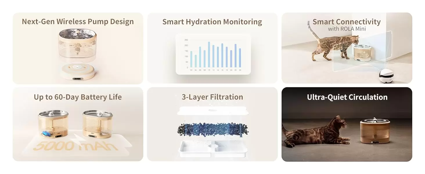 Bienvenido al futuro de la hidratación felina. Esta fuente rompe todas las barreras al ser totalmente inalámbrica: funciona con una batería de larga duración (5000 mAh) que te permite colocarla en cualquier rincón de tu casa sin depender de enchufes. Pero no pierde inteligencia: gracias a su conexión WiFi y App móvil, puedes monitorear desde tu celular cuánto bebe tu gato y recibir alertas, estés donde estés. Es la unión perfecta de libertad física y control digital.