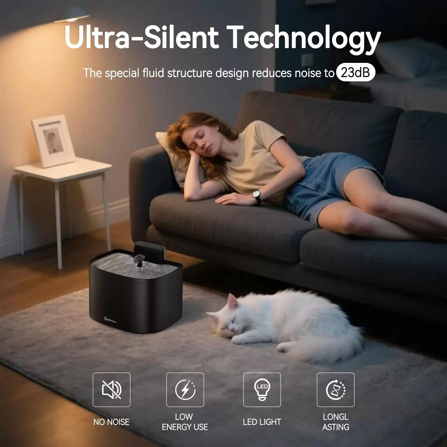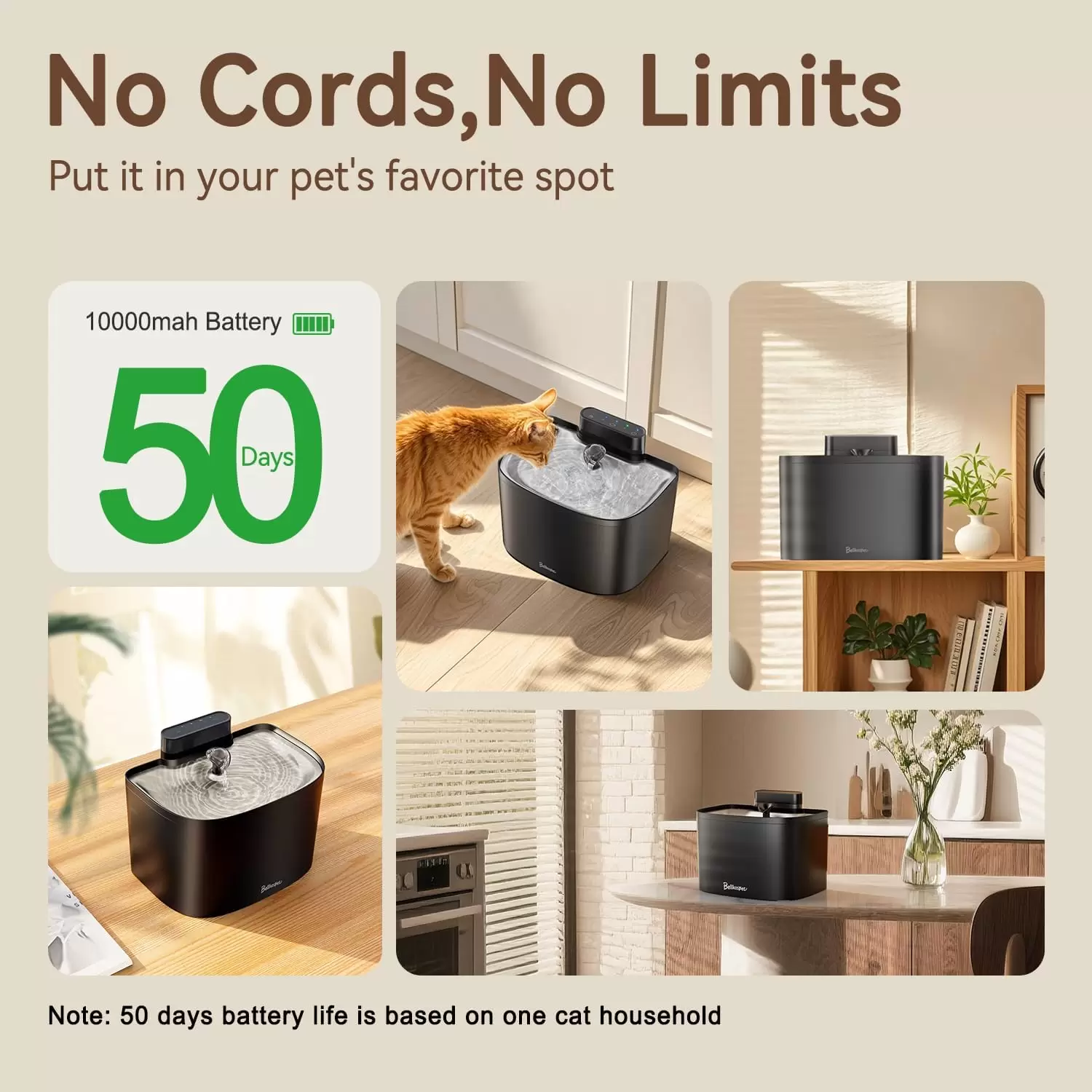 Diseñada para eliminar los cables de tu vida. Su potente batería interna de 10.000 mAh permite colocar la fuente en cualquier lugar de la casa por semanas sin enchufes. La bomba funciona por inducción magnética, lo que significa que no hay cables dentro del tanque de 3.6 litros, haciendo que el agua sea 100% segura (sin riesgo eléctrico) y la limpieza sea increíblemente rápida.