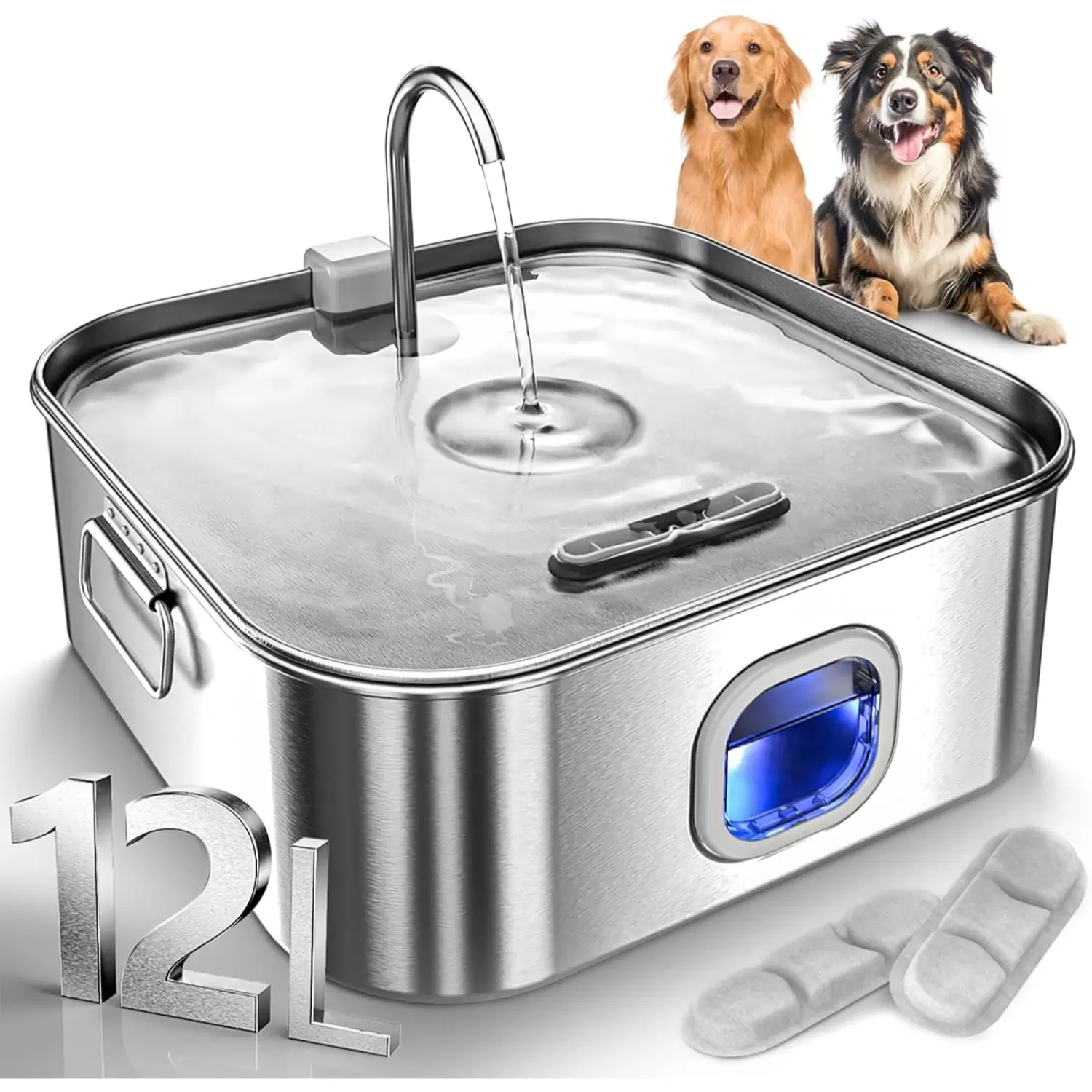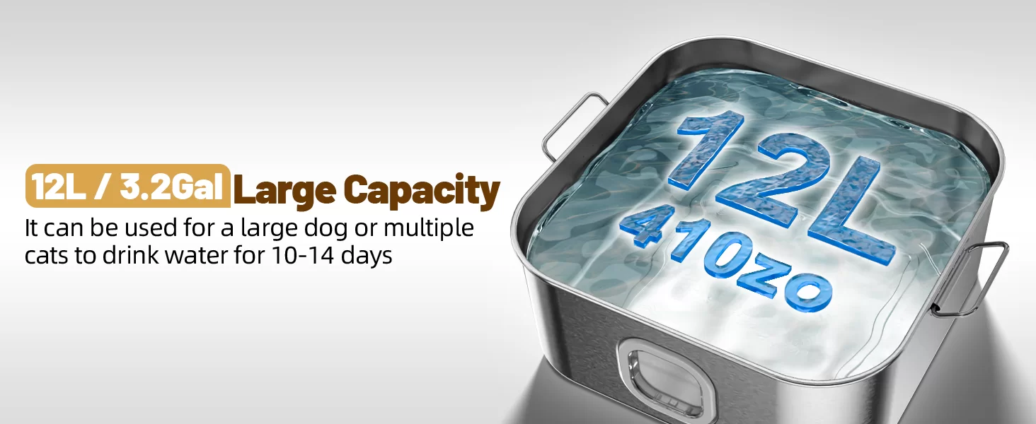 Gran capacidad de 12 litros: di adiós a los cuencos de agua desordenados y al llenado constante. La gran fuente de agua para perros en el interior con la gran capacidad de 12 l/3.2 galones, satisface fácilmente las necesidades de todos los perros de raza o múltiples mascotas agua potable al mismo tiempo. Pasarás menos tiempo rellenándolo y más tiempo disfrutando de momentos de calidad con tu amigo peludo.