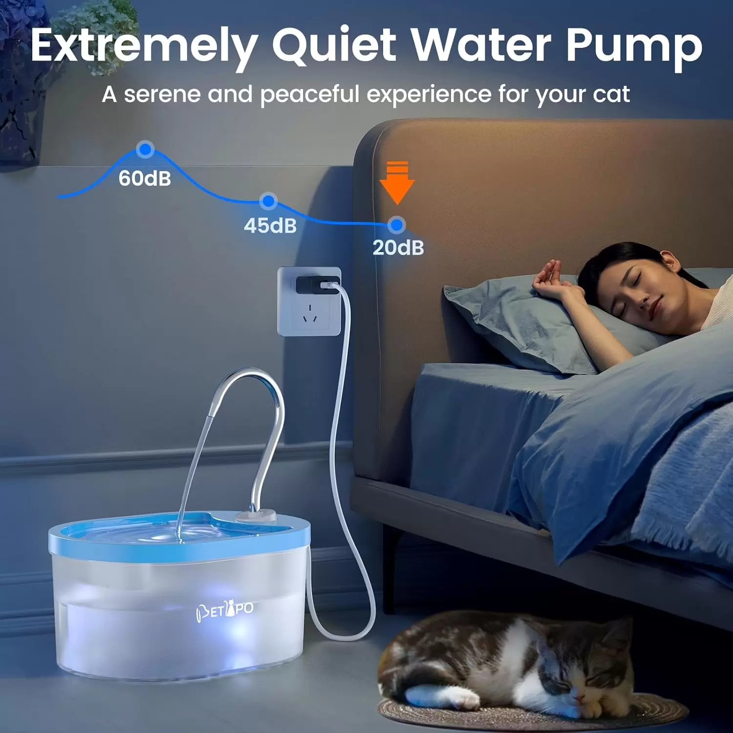 Funcionamiento silencioso: disfruta de la tranquilidad con el diseño de bomba ultra silencioso de Petlipo, volumen de trabajo ≤20 dB, ideal incluso para los gatos más sensibles. La función a prueba de salpicaduras de la fuente para mascotas garantiza un funcionamiento silencioso, manteniendo una experiencia de bebida relajante