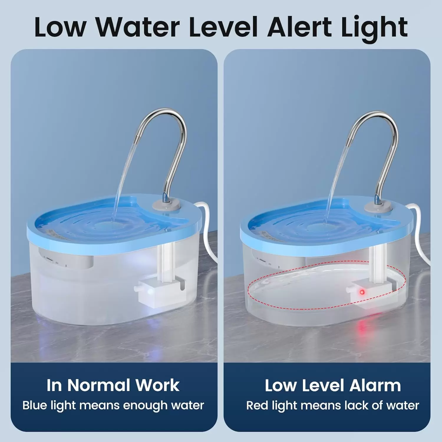 Alerta inteligente de bajo nivel de agua: nuestra fuente de agua automática para gatos está equipada con el indicador LED para controlar los niveles de agua día y noche. Una luz blanca se vuelve roja cuando es hora de rellenar, mientras que el diseño translúcido permite controles fáciles del nivel de agua. Si el nivel del agua es demasiado bajo, se iluminará una luz roja y se apagará automáticamente por escasez de agua. Este diseño inteligente evita la combustión en seco, prolongando así la vida útil de la bomba