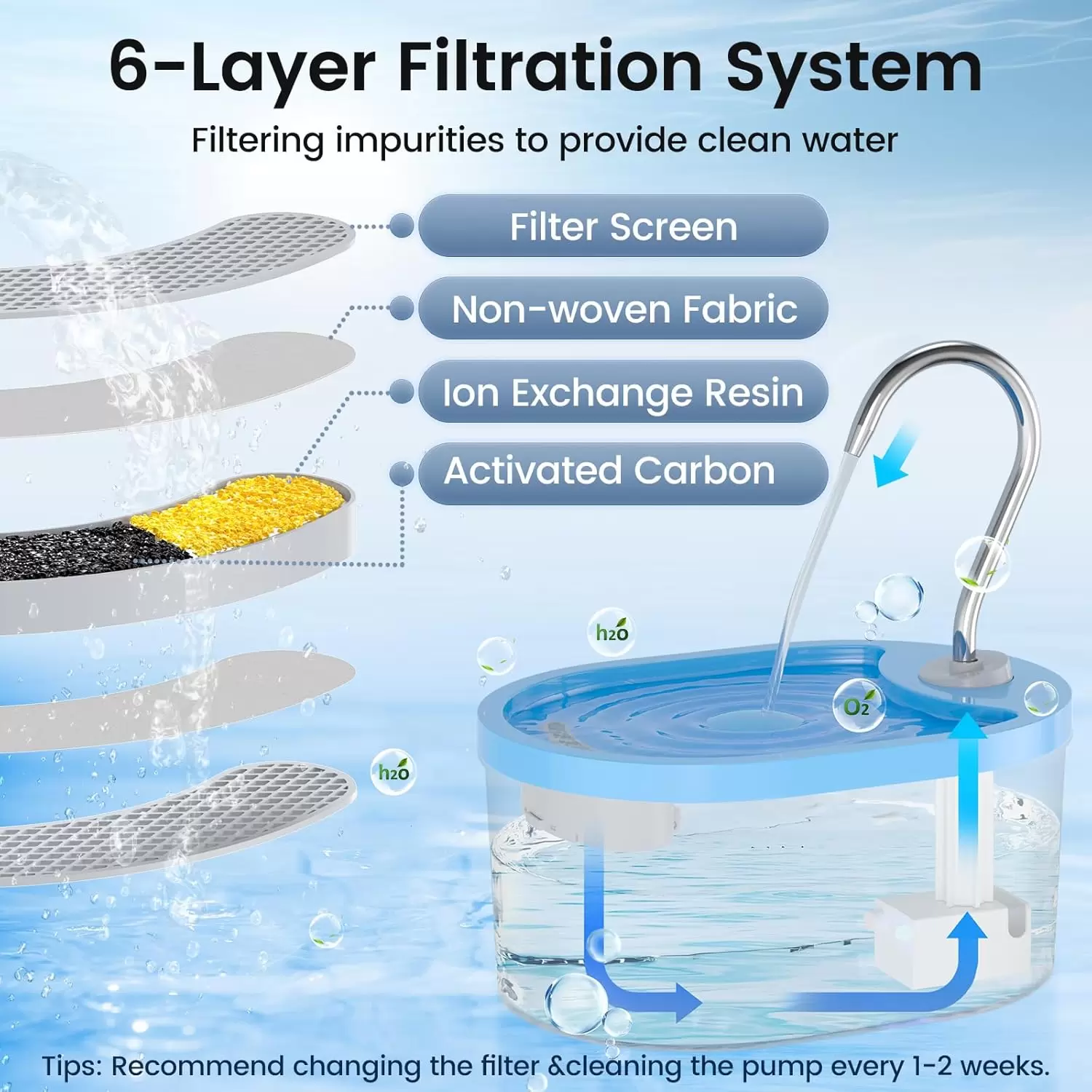 Sistema avanzado de filtración de 6 etapas: mejora la hidratación de tu mascota con la fuente para gatos de Petlipo con un sistema de filtración de 6 capas. Elimina eficazmente las impurezas como el cabello, los residuos, los sedimentos y los olores, asegurando que cada sorbo de agua sea limpio y refrescante