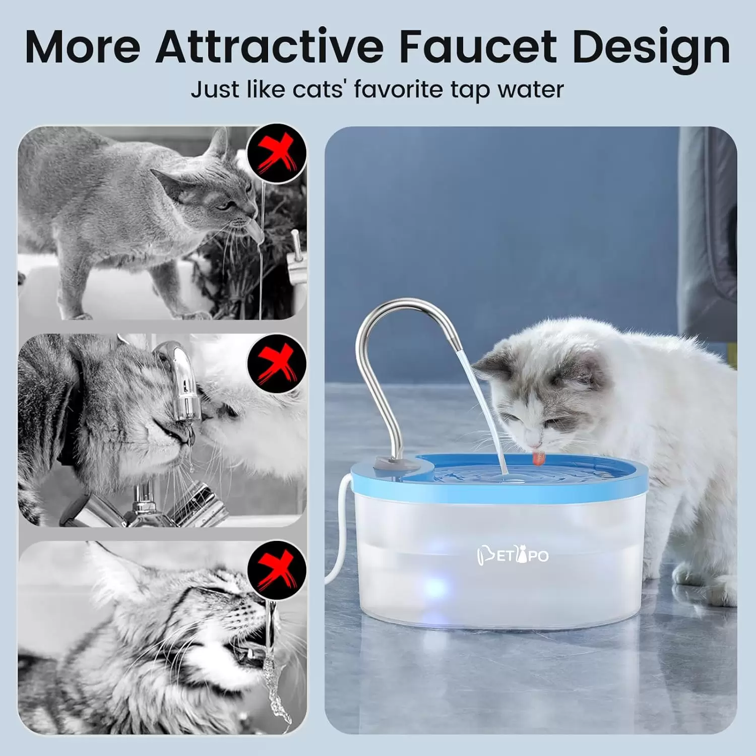 Diseño de grifo para atraer a los gatos: la fuente de agua Petlipo para gatos está diseñada para imitar un grifo, tentando a las mascotas a beber más agua. Promueve hábitos de hidratación saludables, reduciendo el riesgo de problemas urinarios o renales para sus queridas mascotas. La altura del grifo es suave para el cuello de tu gato, asegurando una postura cómoda y saludable para beber