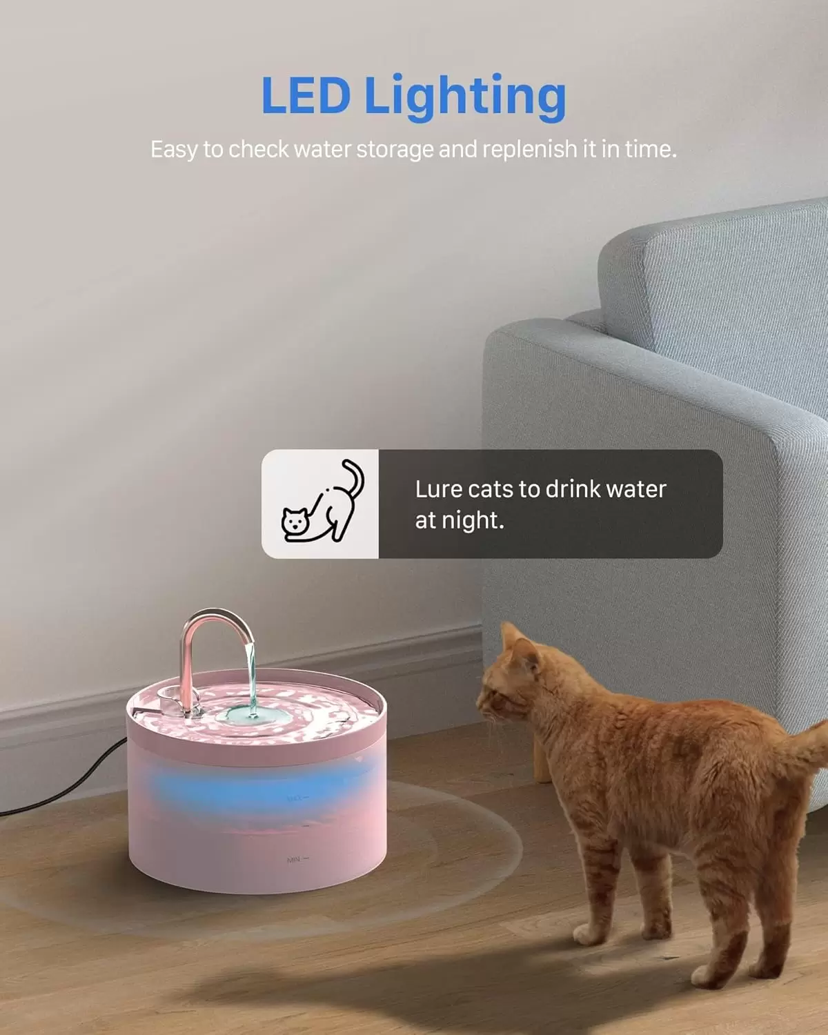 Luz LED incorporada: La fuente para gatos está diseñada con un tanque de agua translúcido y una luz LED incorporada. Puede verificar la cantidad restante de la fuente para gatos en cualquier momento, sin tener que abrir con frecuencia la fuente de agua para gatos. Al mismo tiempo, la luz LED integrada puede brillar en la oscuridad, tu gato puede encontrar la fuente de agua más rápido