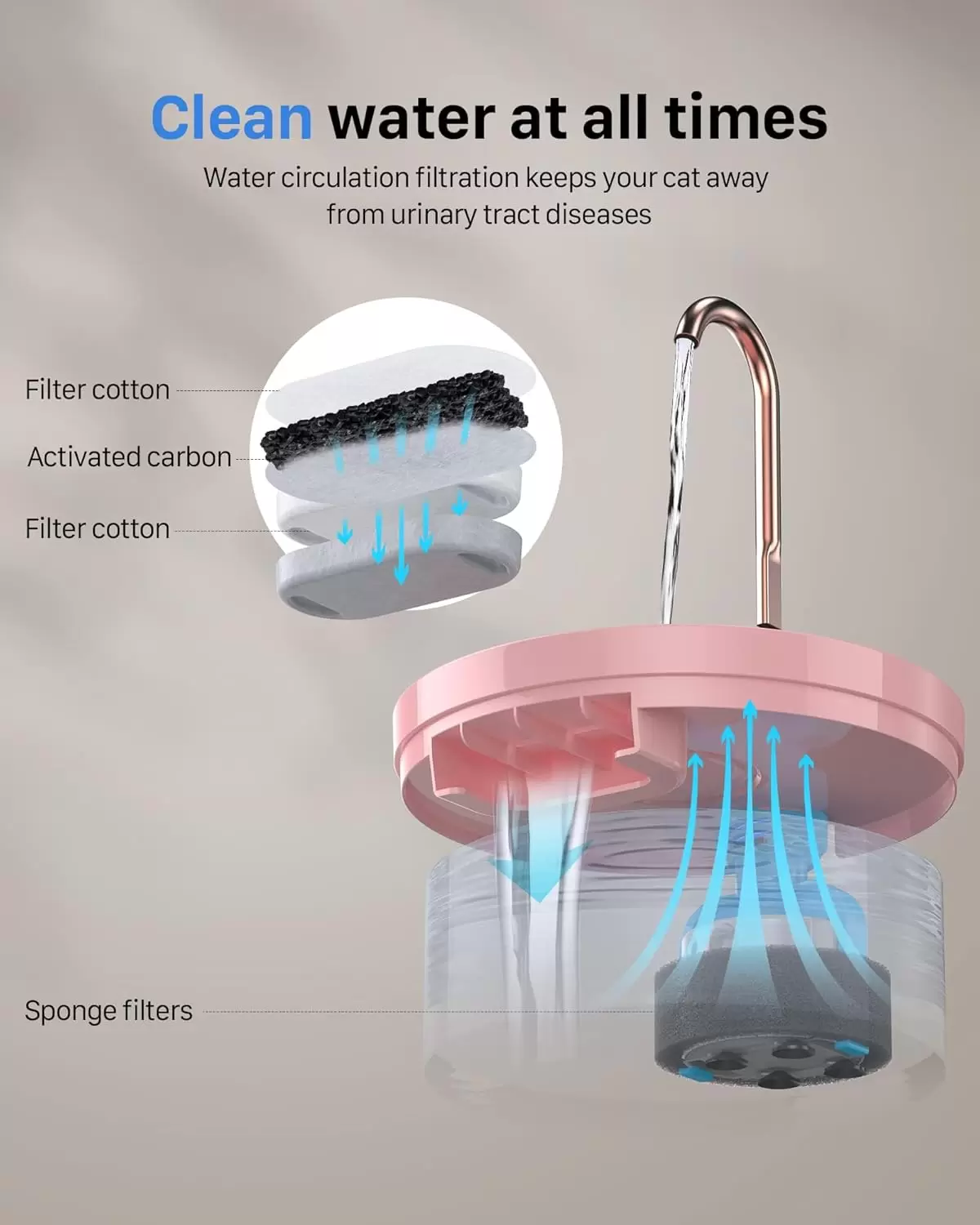 Sistema de filtración triple: La fuente de agua para mascotas adopta un sistema de filtración triple, que incluye carbón activado, capa de algodón de alta densidad y filtro de esponja. Esto puede filtrar eficazmente las impurezas, eliminar olores, suavizar el agua y prolongar la vida útil de la bomba. Es mejor si puede cambiar el filtro de carbono cada 2-4 semanas. Esto proporcionará a tu mascota agua más limpia, fresca y rica en oxígeno