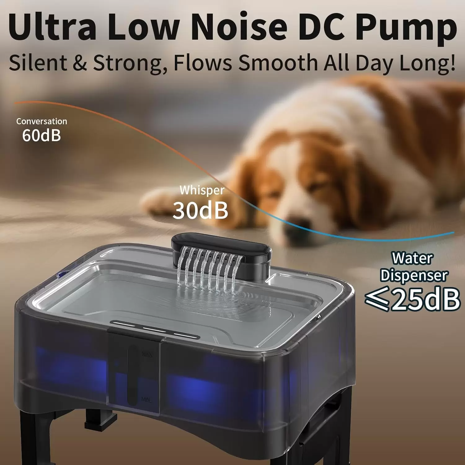 Bomba ultrasilenciosa (<25dB): nuestro dispensador de agua para perros funciona silenciosamente y está equipado con indicador LED de nivel de agua. El agua baja desencadena un cambio de color (azul a rojo) para recordatorios de recarga rápida.