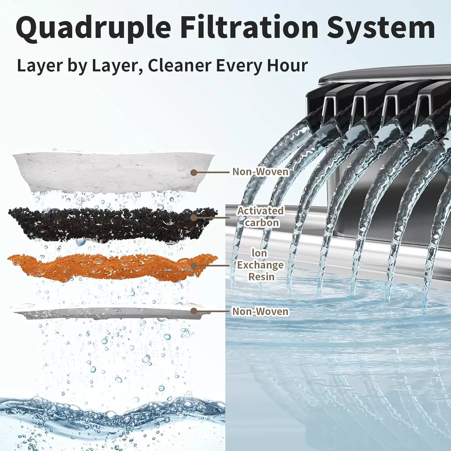 Sistema de filtración multicapa: El filtro en capas adopta tela no tejida, carbón activado y resina de intercambio iónico, eliminando impurezas y suaviza el agua. Reemplazar cada 2 meses para un rendimiento óptimo de la fuente de agua.