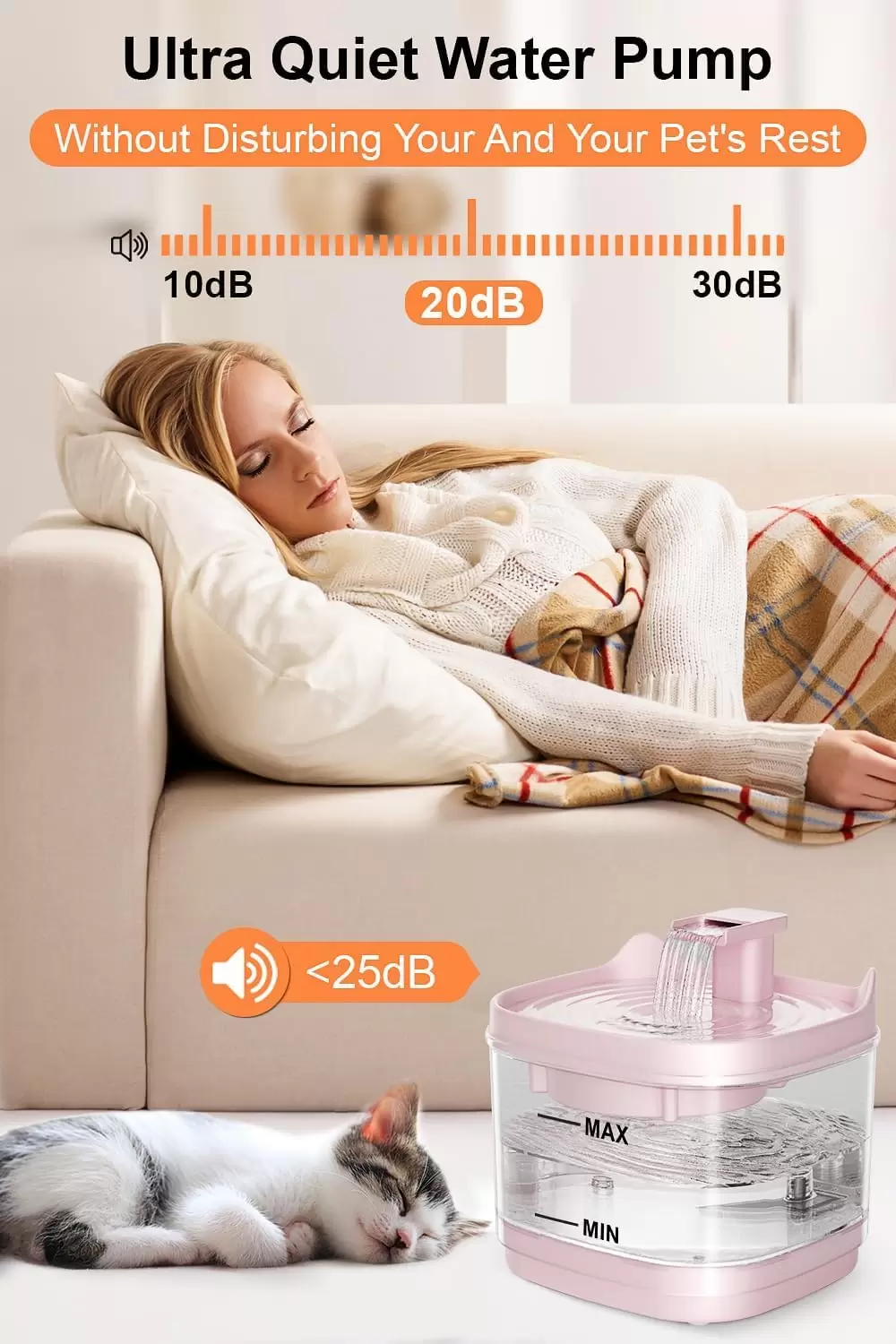 Funcionamiento de bomba ultrasilencioso: baja energía, no molesta el sueño (≤ 16 dB), flujo de agua apenas audible y ruido de la bomba. Esto significa que el cuenco de agua para gatos no afectará el dulce sueño de usted y su mascota.