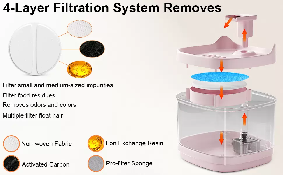 Frescura en cada sorbo: cada gota de agua se filtra a través de un sistema de filtración: el filtro adopta una filtración de cuatro pisos, incluyendo carbón activado, capa de algodón de alta densidad y filtro de esponja. Filtración efectiva de partículas de pelo de mascotas, suciedad e impurezas. Proporciona agua fresca y limpia para los gatos, evita que se enfermen.