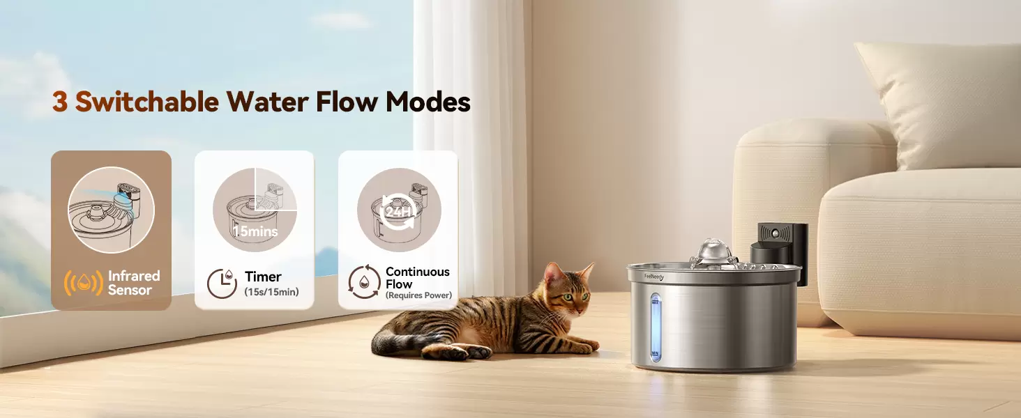 [3 modos de trabajo inteligentes] Nuestras fuentes de agua automáticas para gatos ofrecen 3 modos de trabajo para satisfacer las necesidades de tu mascota: sensor/temporizado/continuo: ① Modo de sensor (rango de 120 ° x 5 pies): el agua corre durante 20 segundos cuando se acerca el gato; ② Modo temporizado: el agua corre durante 15 segundos cada 15 minutos; ③ Modo continuo: el agua fluye continuamente (solo disponible cuando está enchufado). Recomendamos utilizar el modo sensor para ahorrar energía
