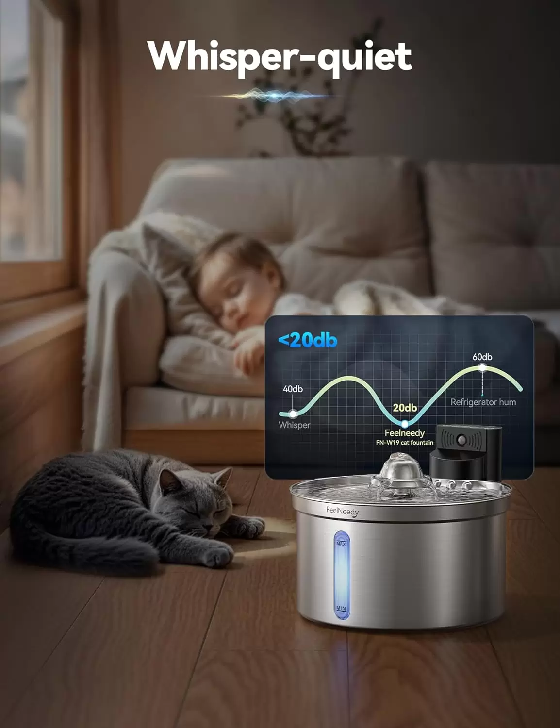 Alertas inteligentes y ultra silenciosas: ruido de la bomba de agua mejorado tan bajo como 20 db, más silencioso que un reloj de tictac, perfecto para mascotas en interiores y sensibles al sonido. Los recordatorios integrados te avisan para reemplazar los filtros y recargar la batería, asegurando un rendimiento óptimo