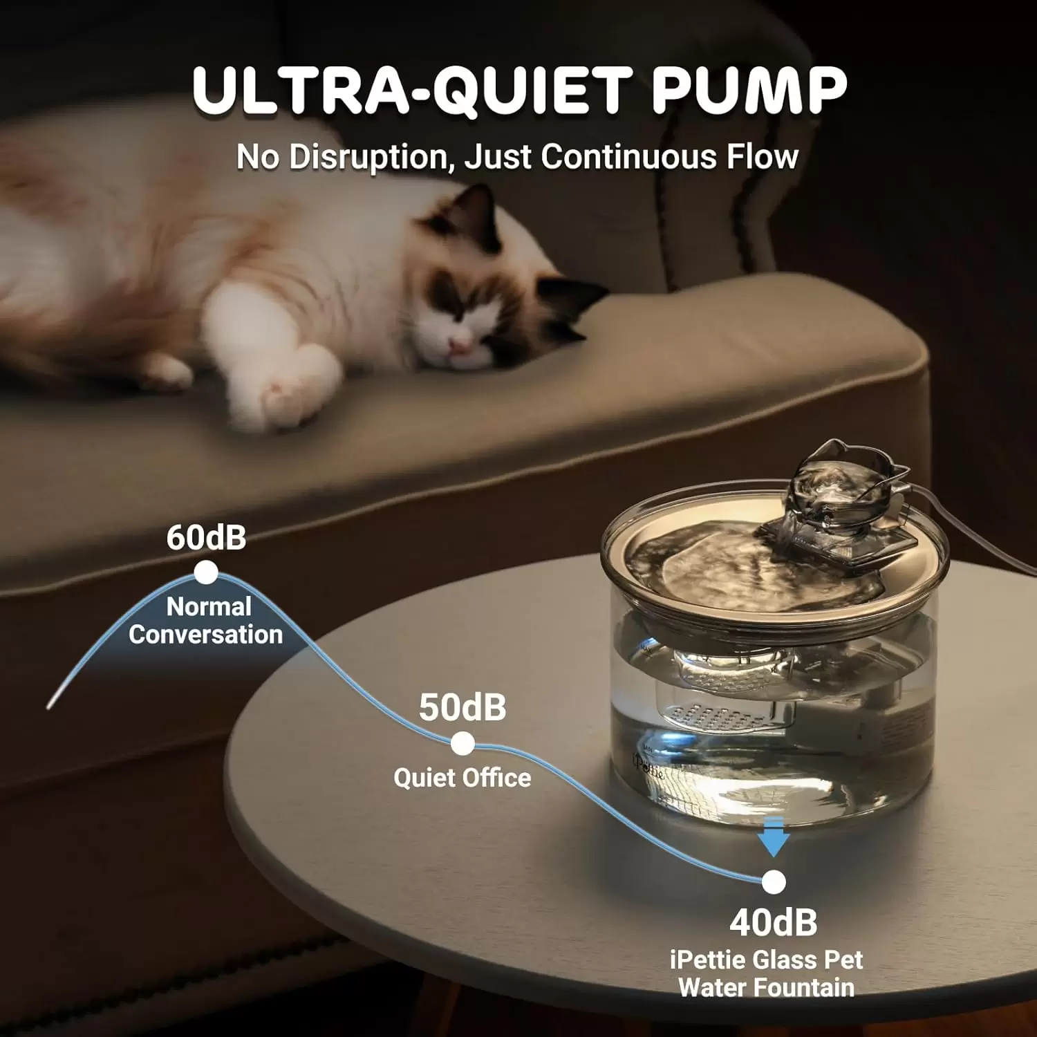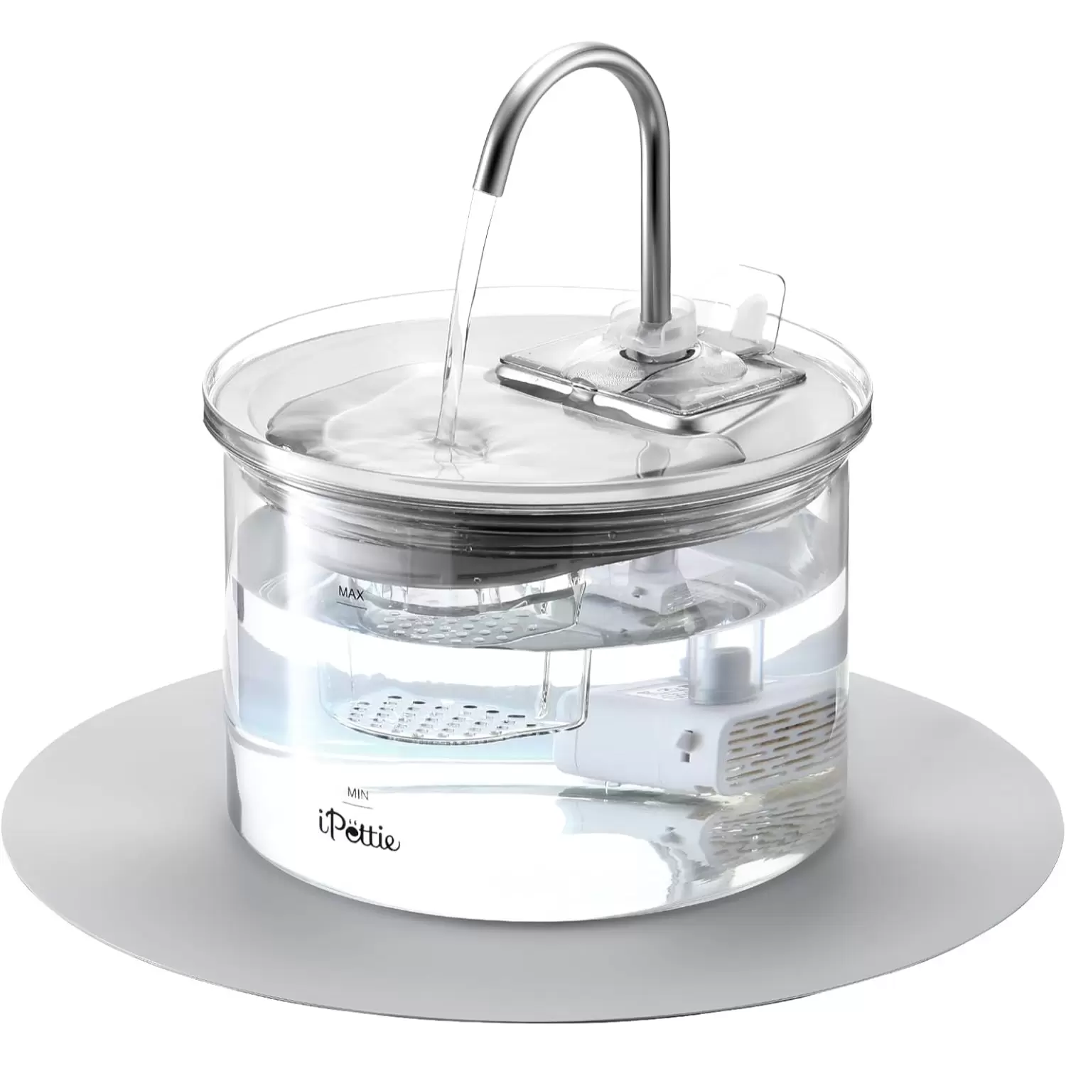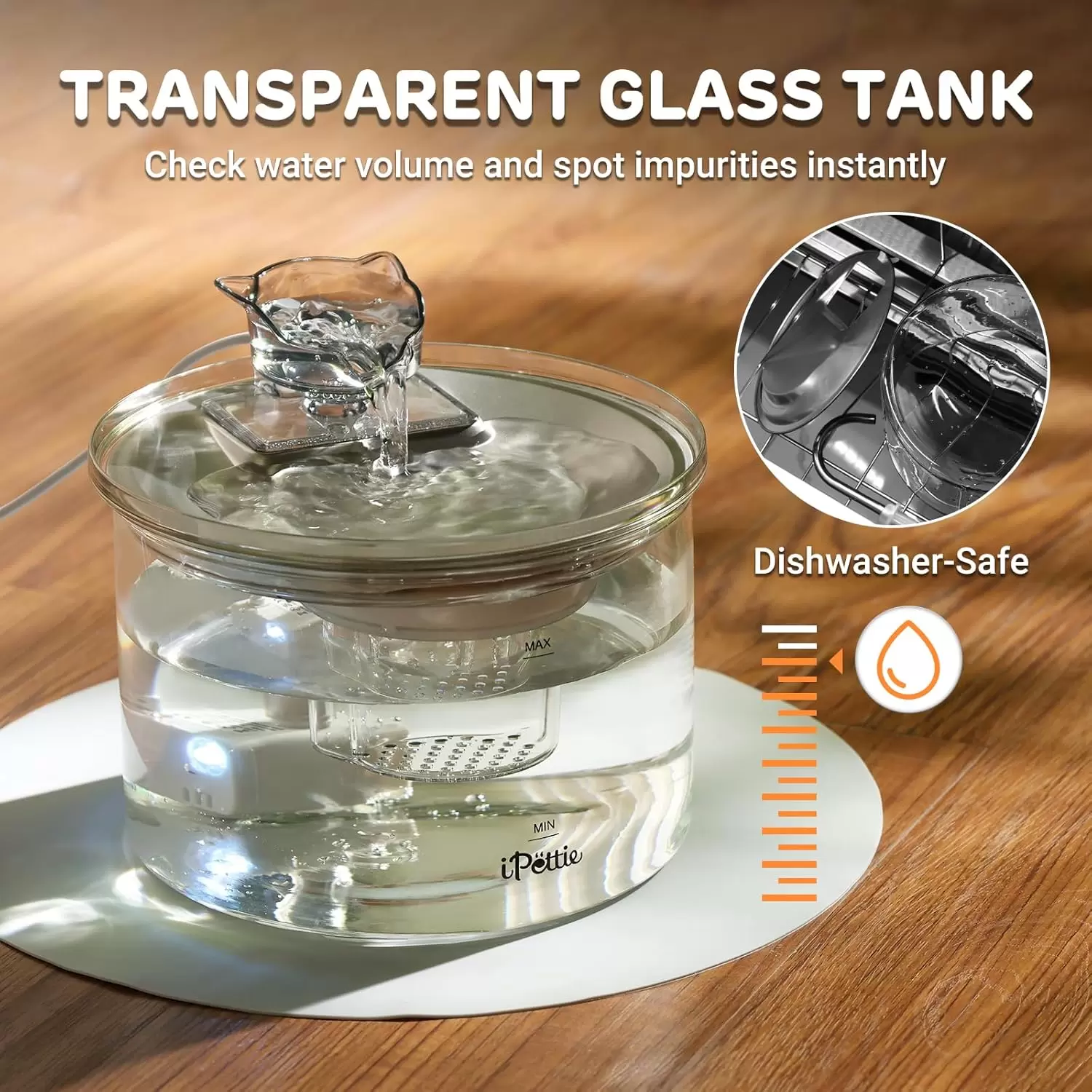 Fuente de 2L con tanque de vidrio y plato de acero inoxidable. Flujo ajustable tipo grifo, fácil de limpiar en lavavajillas y base antideslizante. La máxima higiene para tu mascota.