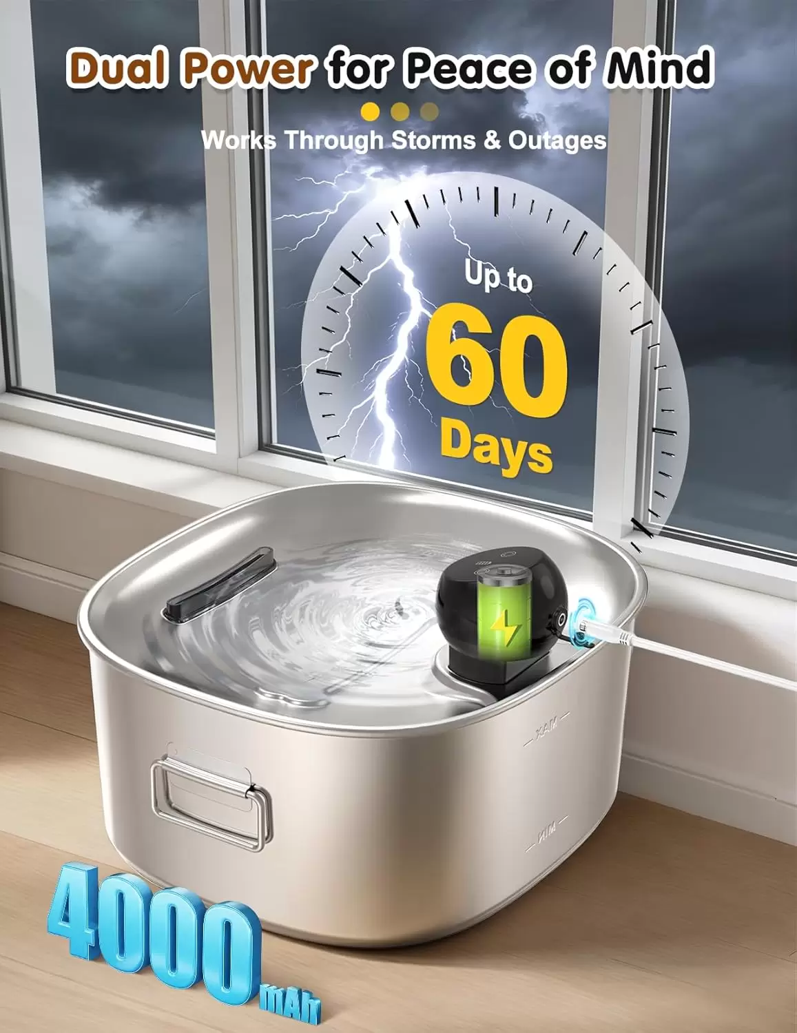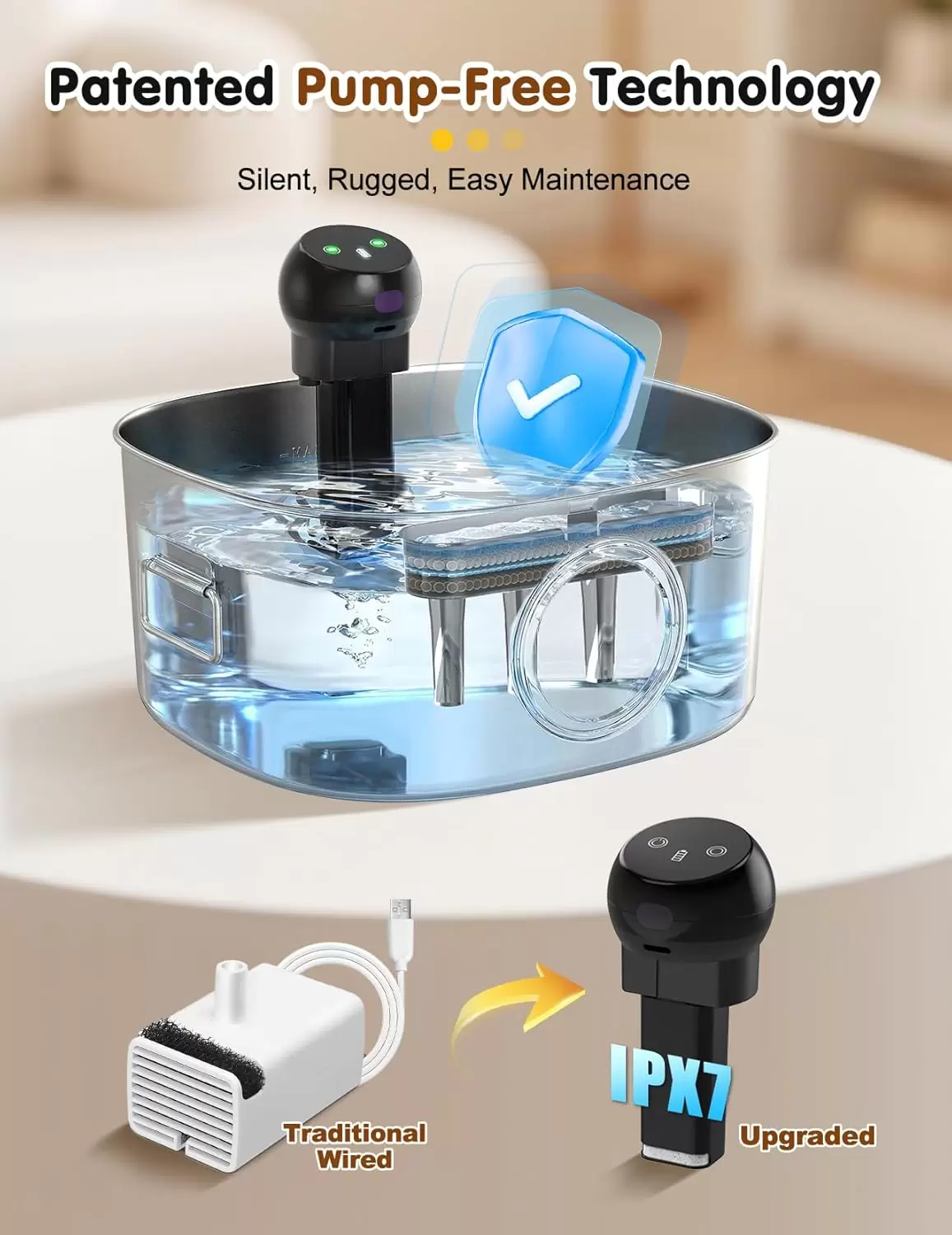Higiene máxima y tecnología silenciosa Este modelo incorpora un motor “Brushless” (sin escobillas) de última generación, que no solo es increíblemente silencioso, sino que garantiza una vida útil mucho mayor que las bombas tradicionales. Su diseño de bomba inalámbrica permite separar el tanque completamente para lavarlo sin luchar con cables. Además, con su batería de respaldo integrada, tienes la tranquilidad de que tus regalones tendrán agua fresca y filtrada incluso si se corta la luz en tu barrio.