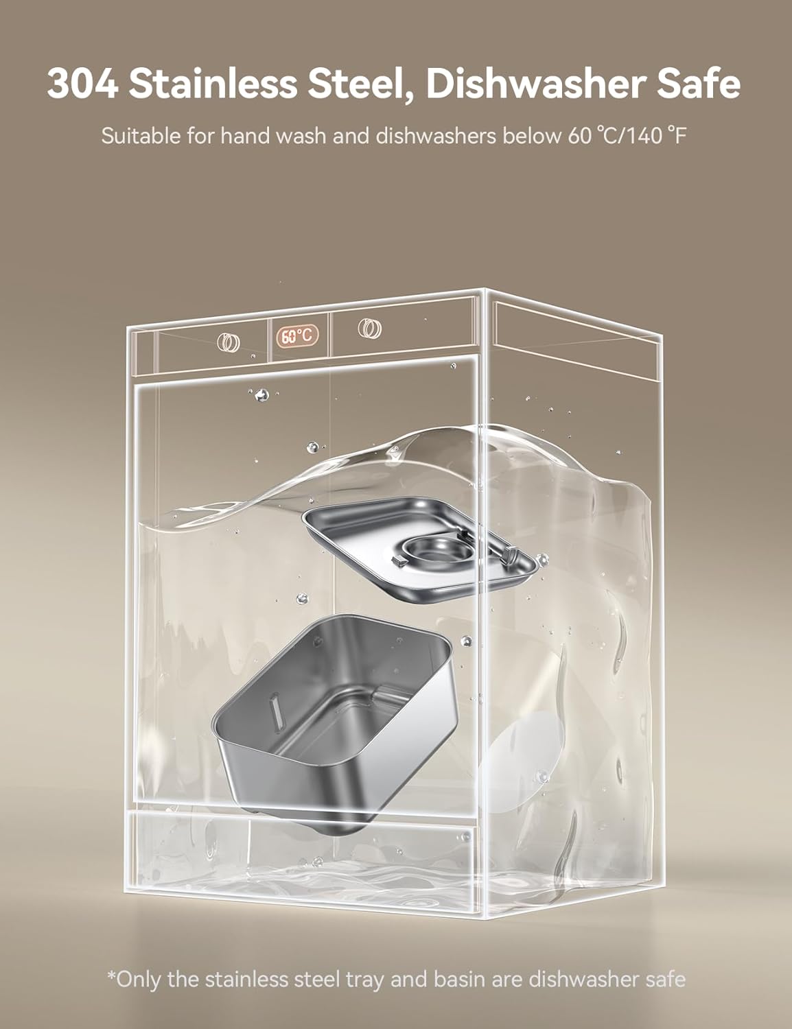 Material de acero inoxidable 304: hecho de acero inoxidable 304, el tanque de agua y la bandeja son más seguros y duraderos que el plástico. Este material garantiza agua limpia y saludable para mascotas y ayuda a prevenir el acné felino. Además, es adecuado para lavavajillas por debajo de 140.0 °F/140 ℉