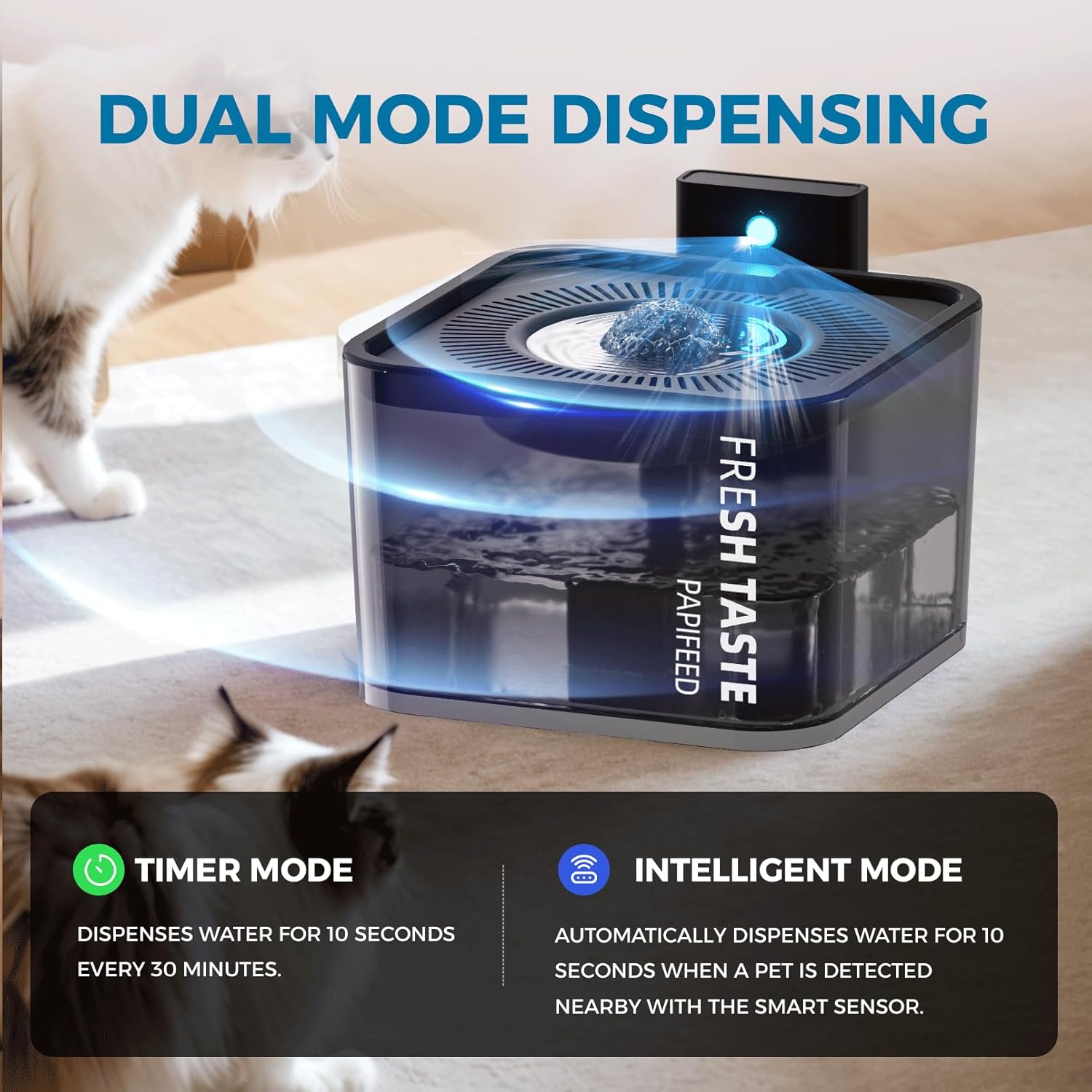 Diseño a prueba de fugas y tanque visible: utiliza un diseño único a prueba de fugas de 360° para reducir la preocupación de derrames. El dispensador de agua para gatos PAPIFEED está diseñado con tanque translúcido de 360° con adhesivo indicador de nivel de agua, lo que te permite controlar la ingesta diaria de agua y la calidad del agua de tu mascota, y proporcionar a tu mascota un ambiente de bebida saludable y seguro.