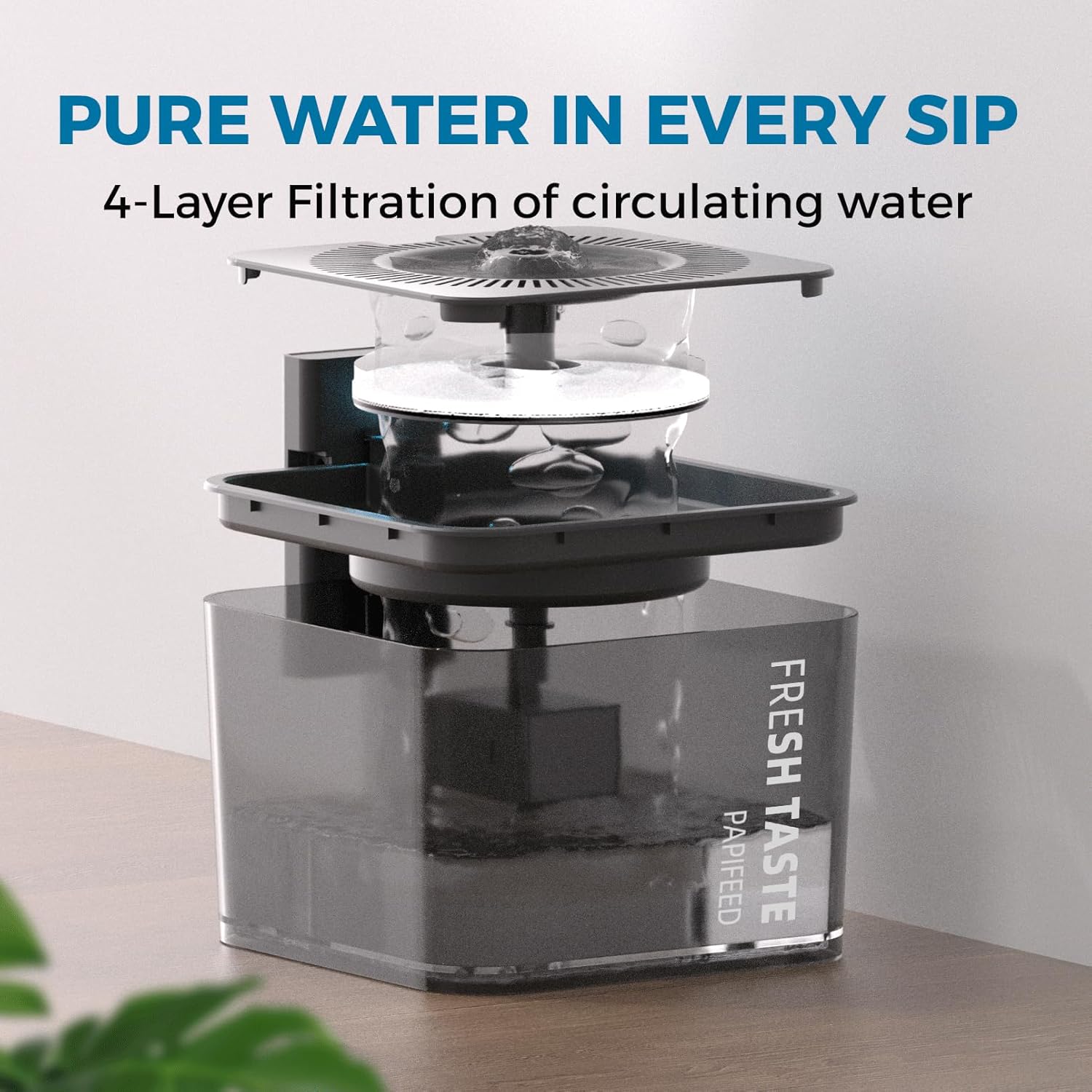 Múltiples capas de filtración: el dispensador de agua para mascotas PAPIFEED está equipado con una capa de algodón, carbón activado y esponja de prefiltro para purificación de la circulación del agua, eliminando eficazmente las impurezas del agua. ¡Las mascotas pueden beber agua más limpia! Si usa agua dura, se recomienda limpiar el dispensador de agua una vez a la semana.