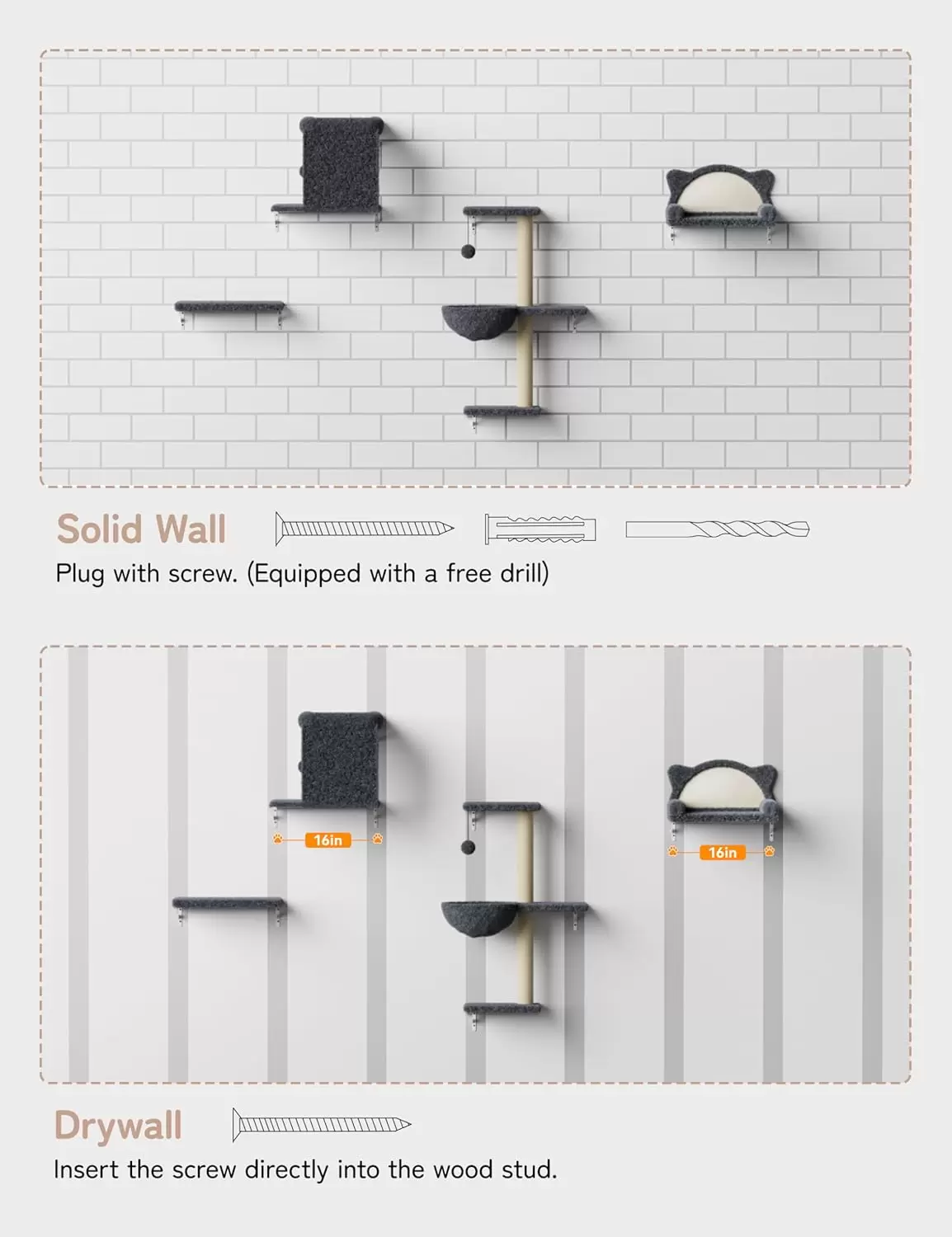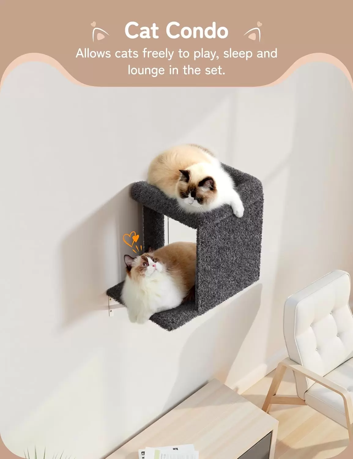 Perchas Extra Anchas y Cesta Colgante: El diseño expandido le da a su felino un amplio espacio para estirarse. La cesta oscilante y el cubiculo de dos pisos transforman su pared en un gimnasio de la jungla donde los gatos pueden descansar y vigilar su reino con total comodidad.