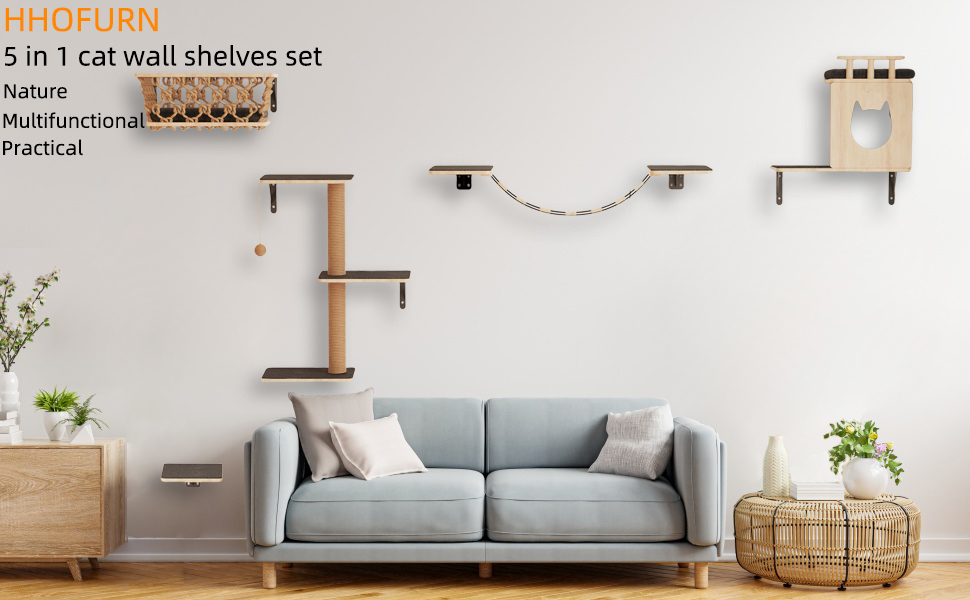 Gimnasio de Pared para Gatos Set 5 en 1 de Madera Solida con Cesta y Estantes Reforzados.