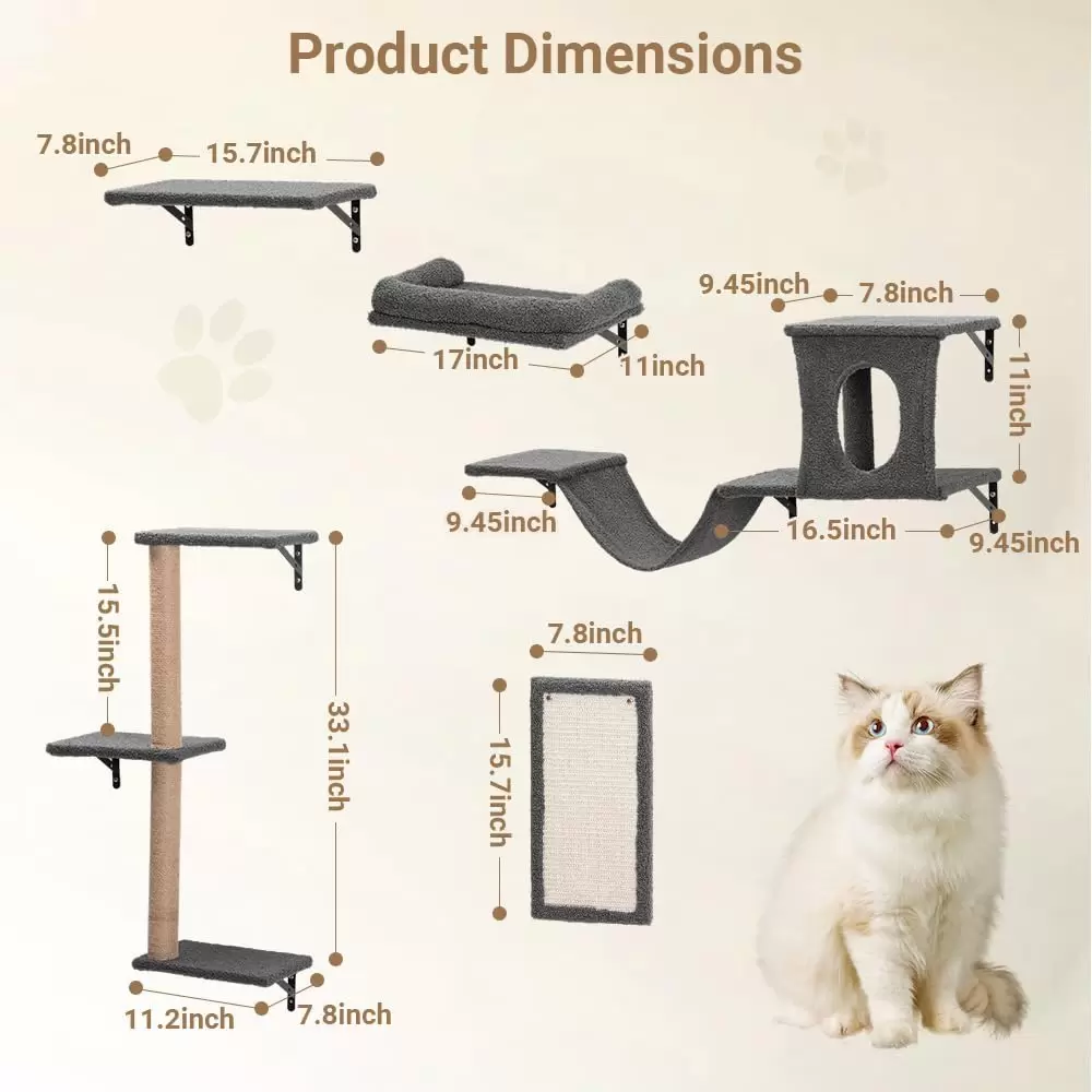 Set de 5 piezas de gimnasio mural para gatos. Madera solida y terciopelo suave. Incluye puente, cama y rascadores. Ahorra espacio y es facil de instalar.