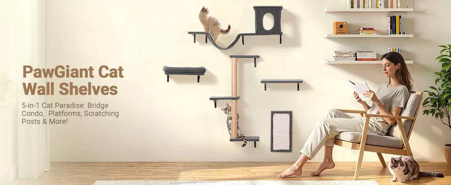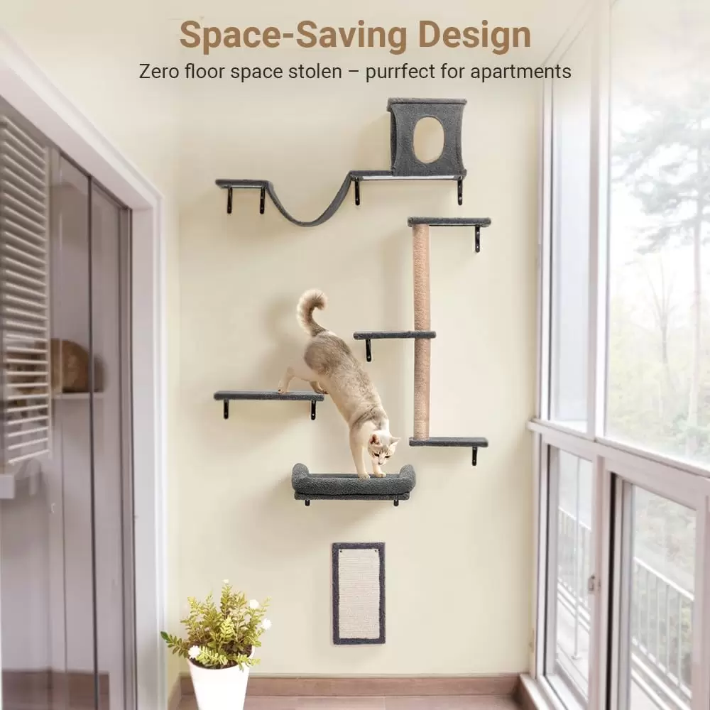 Este set todo en uno transforma sus paredes en un parque de diversiones vertical, ahorrando espacio en su hogar y ofreciendo a su gato el lugar perfecto para jugar y descansar.