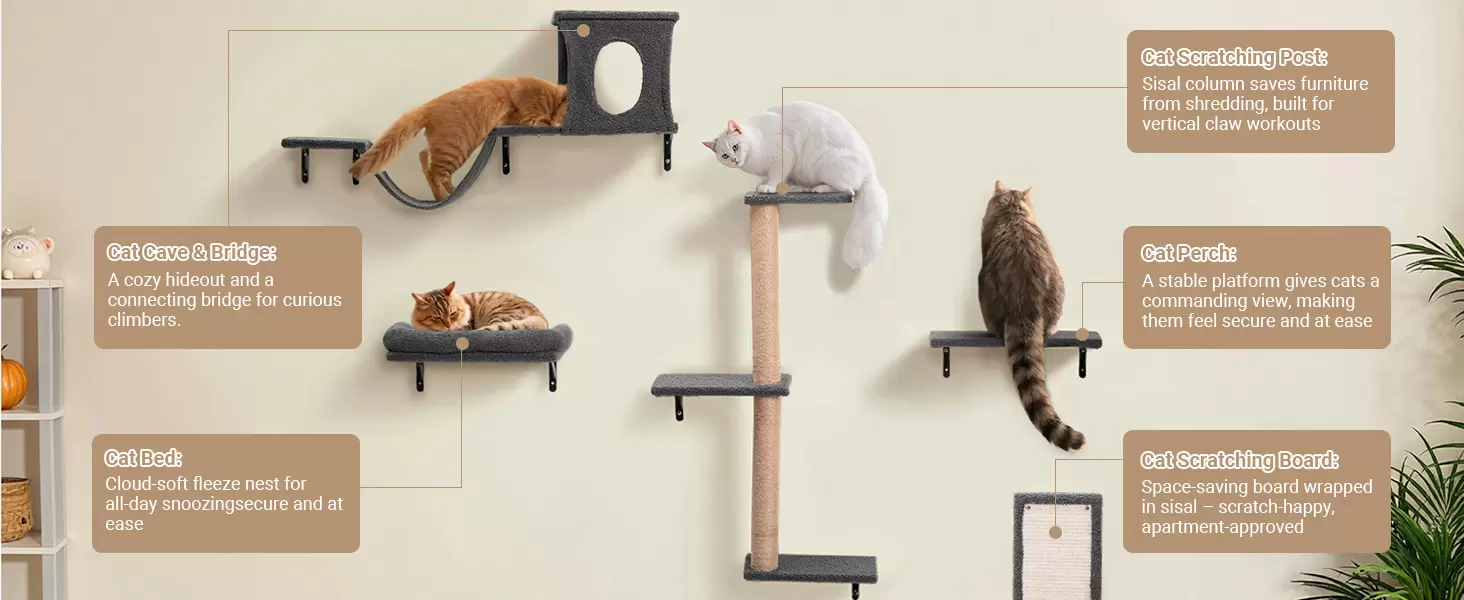 Gimnasio de Pared para Gatos Set 5 Piezas: Puente, Cama y Rascador de Madera Solida
