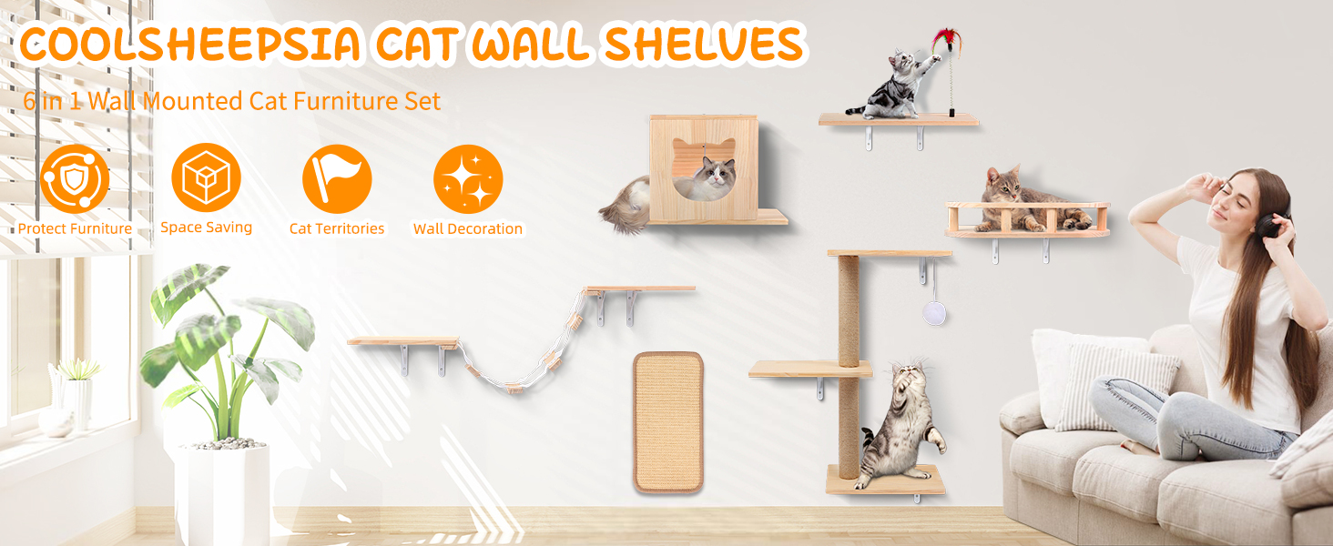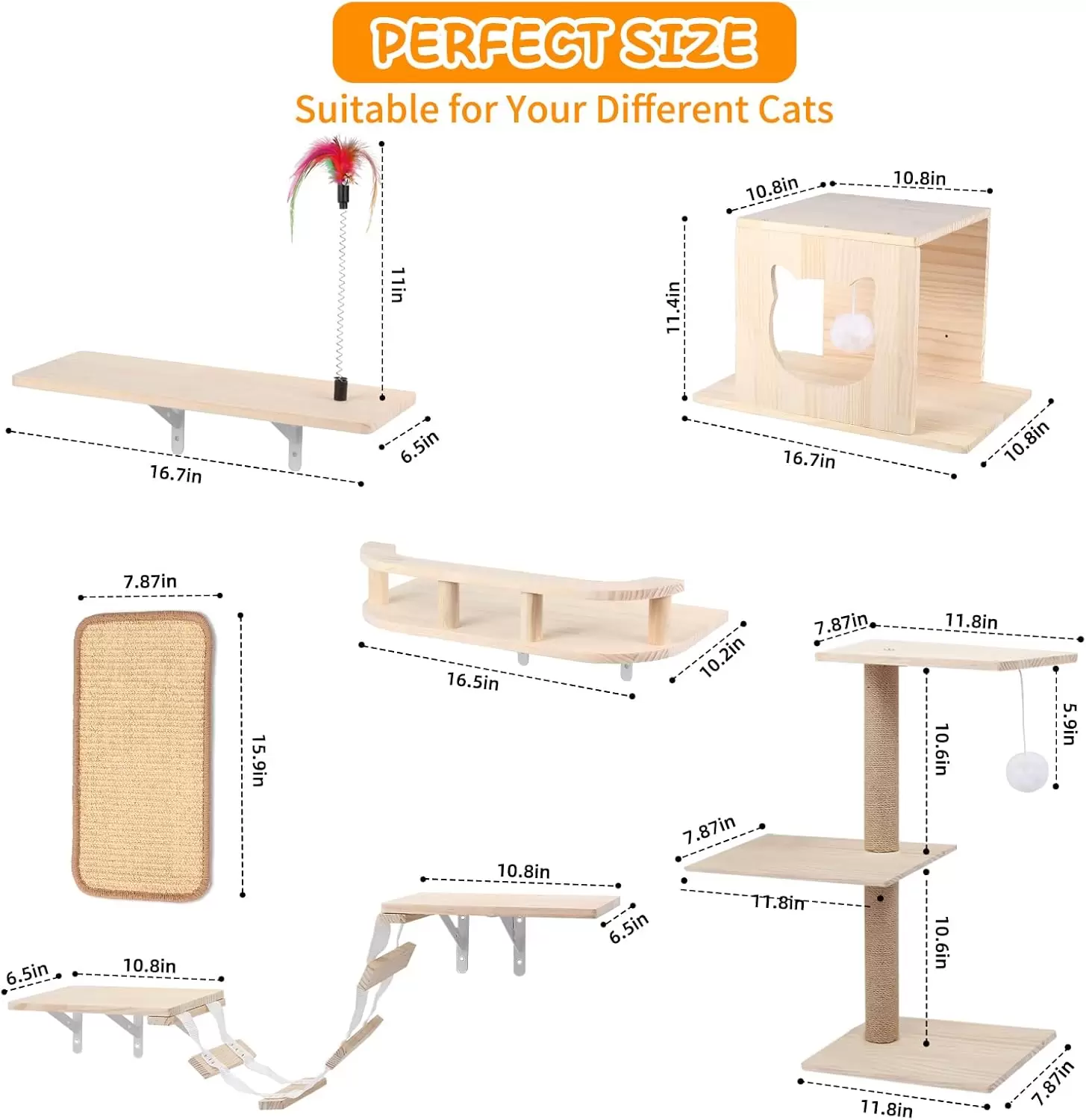 Set de 6 piezas de gimnasio mural para gatos. Madera solida resistente hasta 18 kilos. Incluye casa, puente y rascador. Ahorra espacio y decora con estilo moderno.