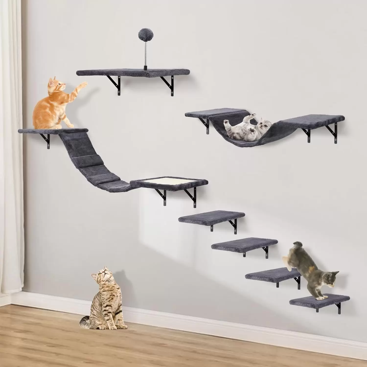 Mantenga a su gato de interior feliz y entretenido con este completo set de 7 piezas montado en la pared. Es la solucion perfecta para quienes buscan ahorrar espacio y ofrecer un circuito de diversion vertical de alta calidad.