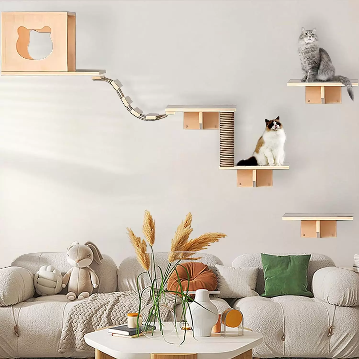 Set de 7 piezas murales para gatos. Madera de pino solida. Incluye casa, escalera y rascador. Ahorra espacio y decora. Ideal para departamentos.