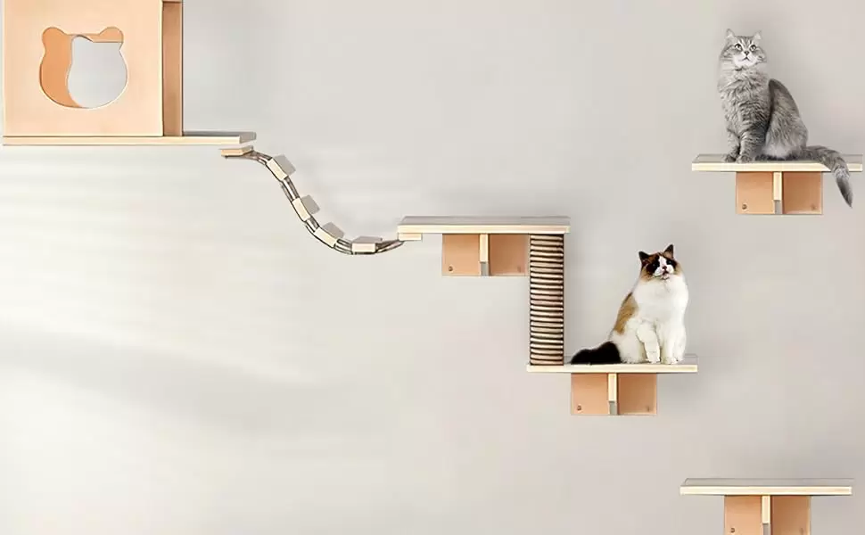 Set de Lujo de 7 Piezas Todo en Uno: Este juego lo tiene todo. Incluye 1 casa condominio tipo cubo, 4 estantes o repisas de pared, 1 escalera puente y 1 poste rascador. Es la estructura perfecta para evocar el instinto natural de trepar, saltar y rascar, ofreciendo una zona de juego divertida y una vision panoramica.