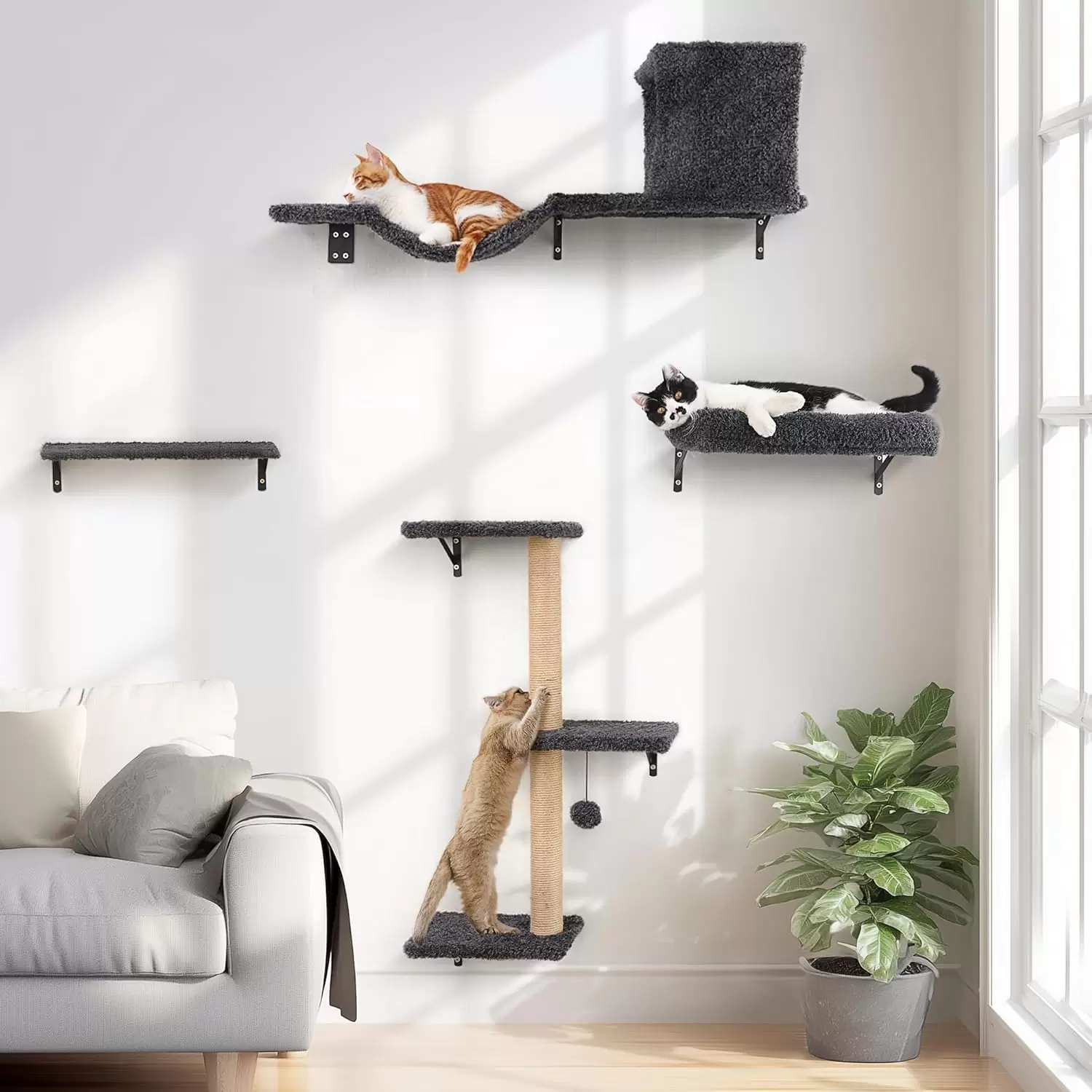Este set de muebles de pared es la solucion perfecta para crear un parque de diversiones vertical para su gato, ahorrando espacio y decorando su hogar con un estilo natural.