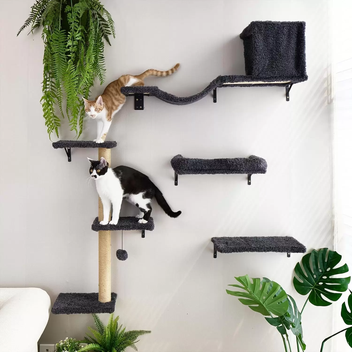 Todo en Uno para Juego y Descanso: El set incluye puente colgante, cama de pared, poste rascador y estantes. Sus gatos pueden dormir, saltar y rascar en un solo lugar. Puede armar su propio gimnasio tipo jungla segun su gusto y las necesidades de su mascota.