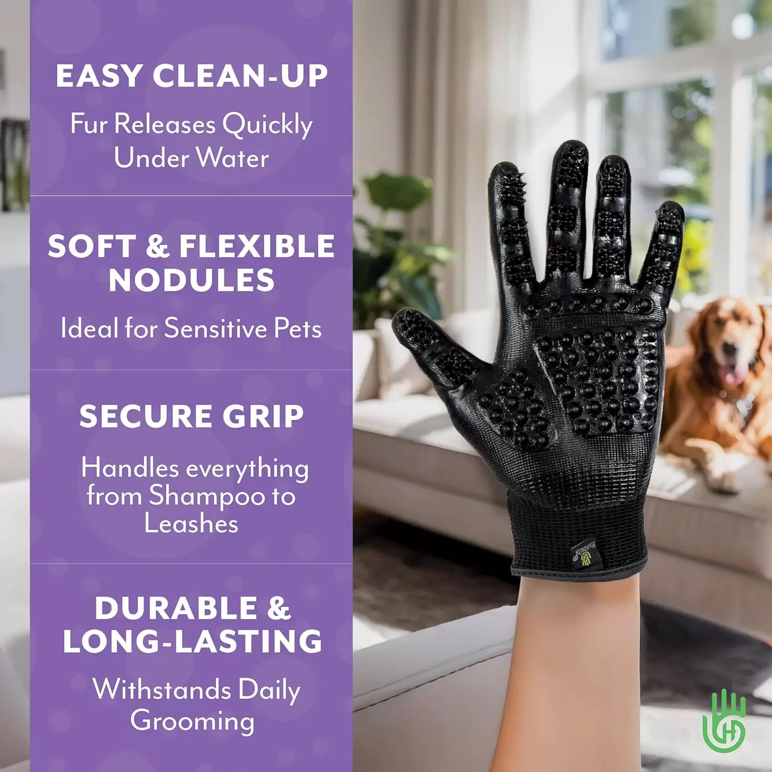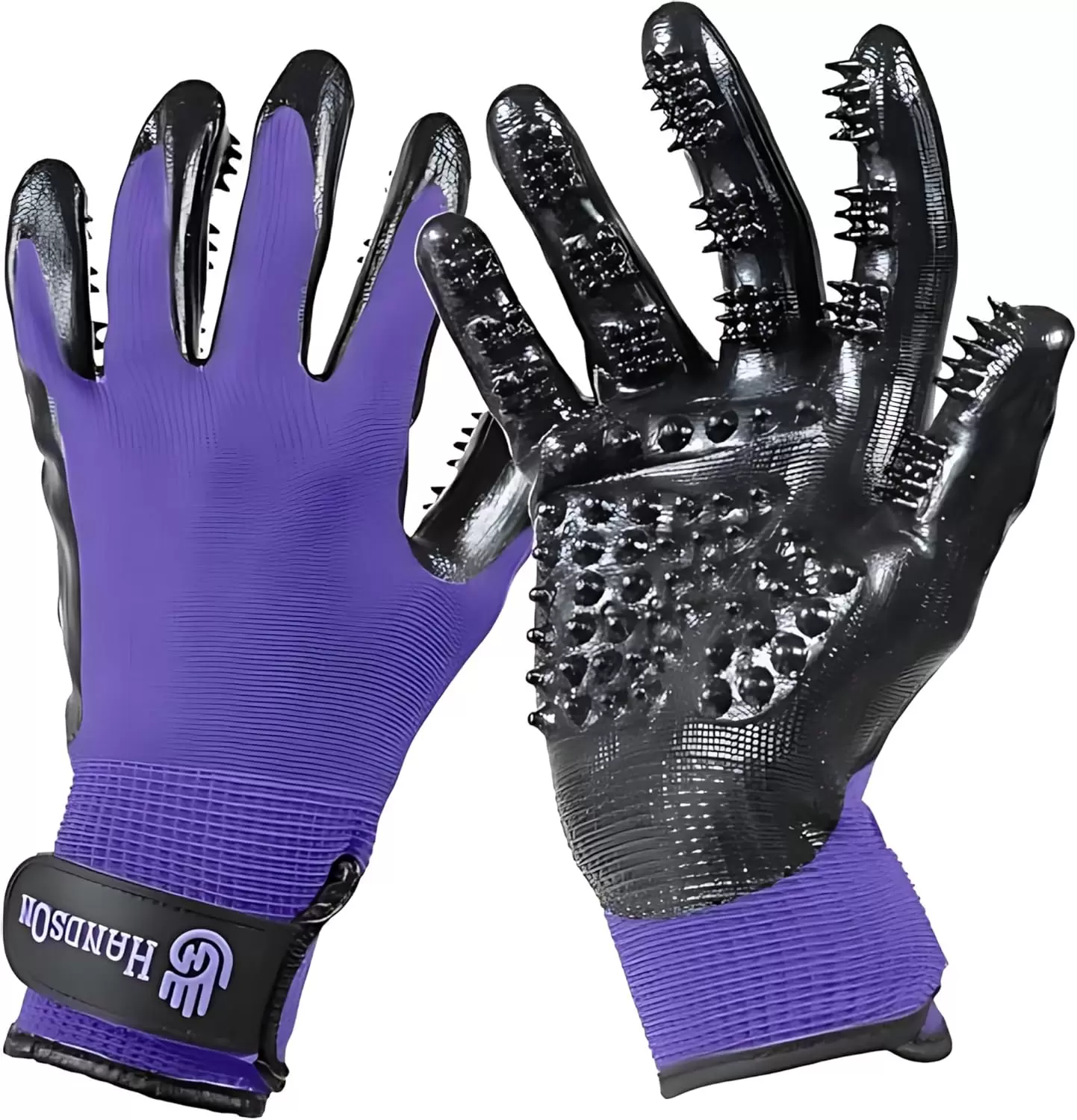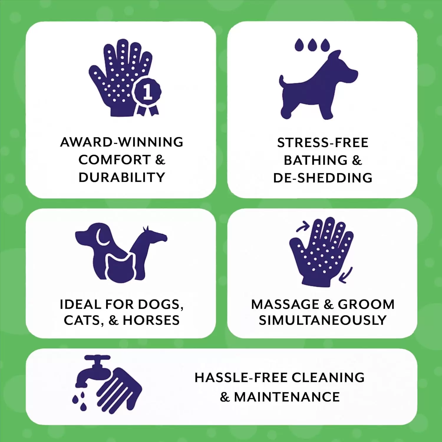 Guantes galardonados para el cuidado de mascotas. Úsalos para cepillar, bañar y masajear, eliminando pelo muerto de forma suave. Apto para perros, gatos y caballos.