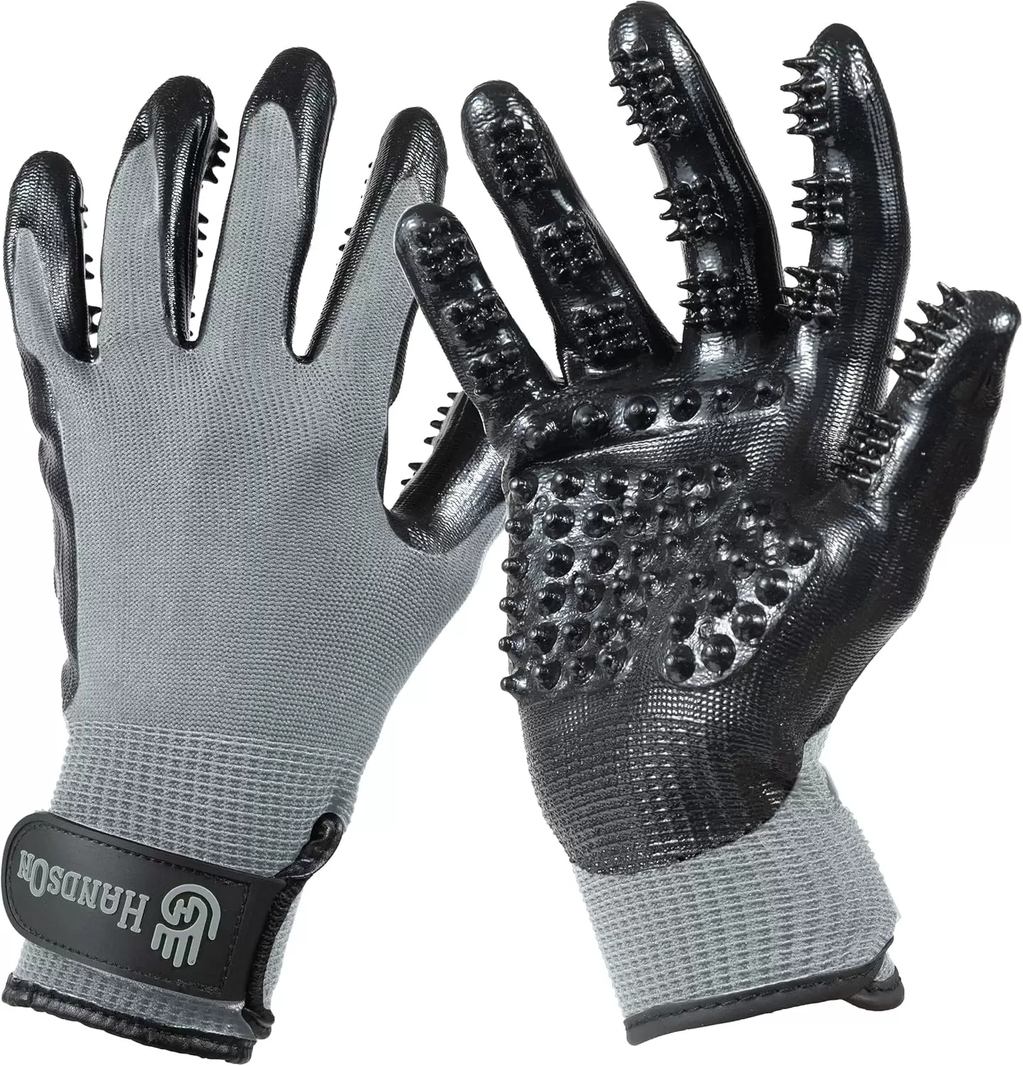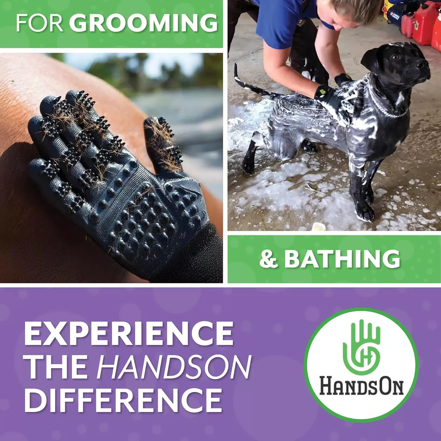 Cepilla, quita el exceso de pelo, baña y masajea suavemente a las mascotas: Estos guantes de cinco dedos de HandsOn tienen dientes en los dedos y puntas redondeadas en las palmas que hacen que sean una herramienta versátil ideal para expertos, para cepillar, quitar el exceso de pelo, bañar o masajear a tu animal. Este par de guantes elimina suavemente el exceso de pelo, los residuos y los enredos mientras mantiene tus manos y uñas limpias de la suciedad y la grasa