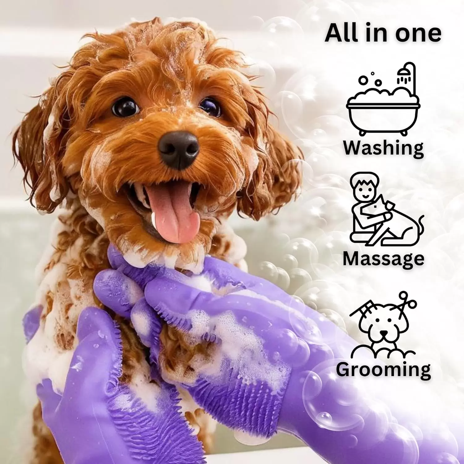 Guantes de silicona para baño de mascotas. Las cerdas suaves limpian profundamente la piel, mejoran la circulación y eliminan el pelo, haciendo el baño una experiencia agradable.