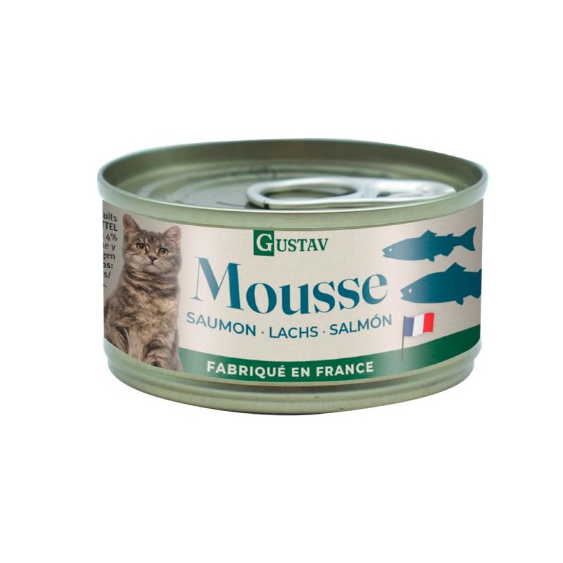 Mousse de gato Gustav con el delicioso sabor del salmón, una receta única hecha en Francia que hará las delicias del paladar de tu gato…
