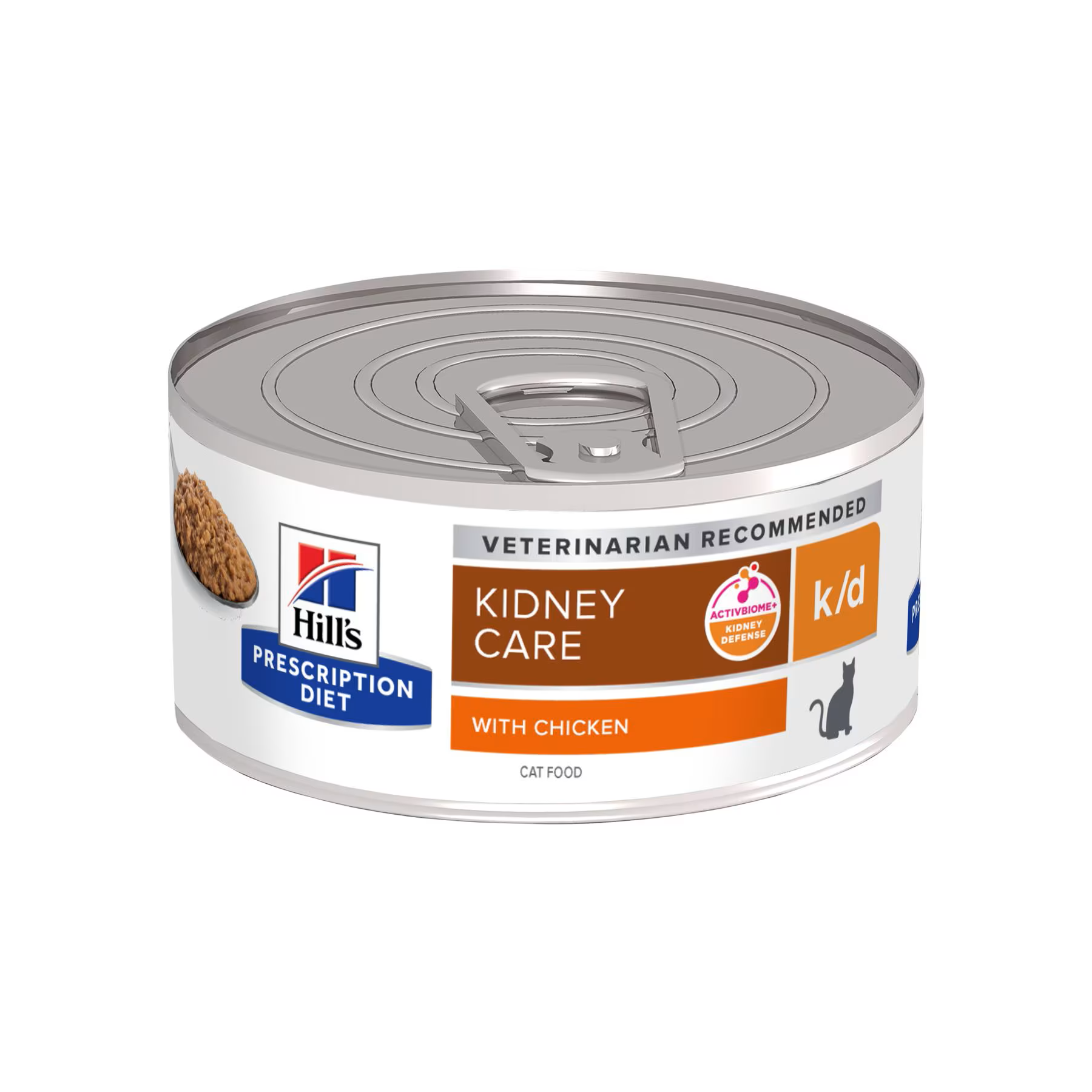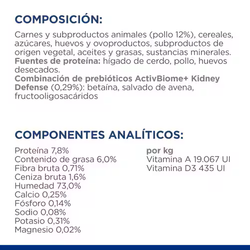 Los nutricionistas y veterinarios de Hill’s han desarrollado la nutrición clínica Hill’s Prescription Diet k/d con ActivBiome+ Kidney Defense, una combinación exclusiva de prebióticos que ha probado que nutre al microbioma intestinal para ayudar a proteger la función renal vital. Prescription Diet k/d está disponible en múltiples formatos húmedos y sabores para conquistar incluso los paladares más exigentes. Este alimento húmedo está elaborado con pollo y tiene un sabor irresistible que a tu gato le encantará. De hecho, Prescription Diet k/d es una nutrición clínicamente probada para mejorar y prolongar la calidad de vida.