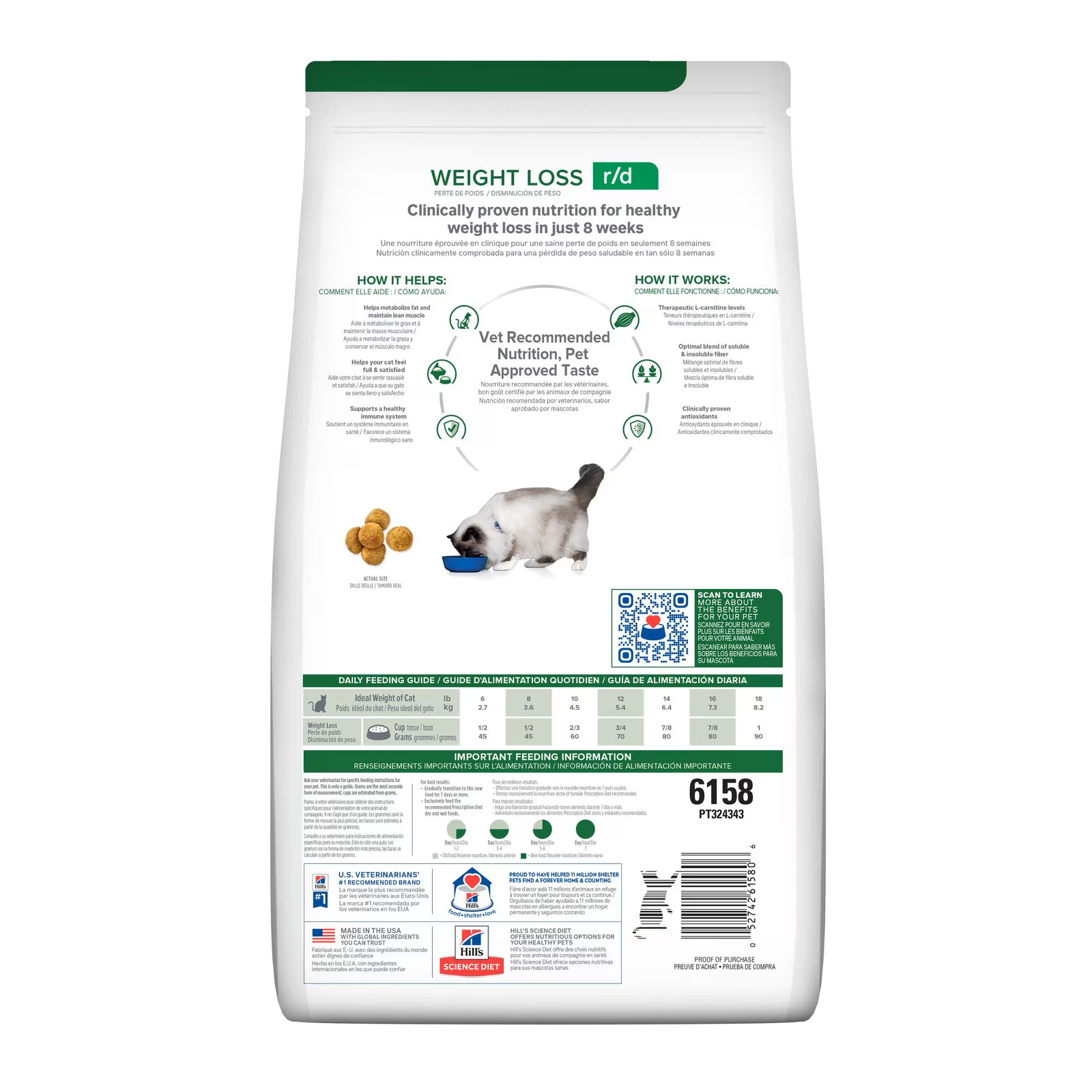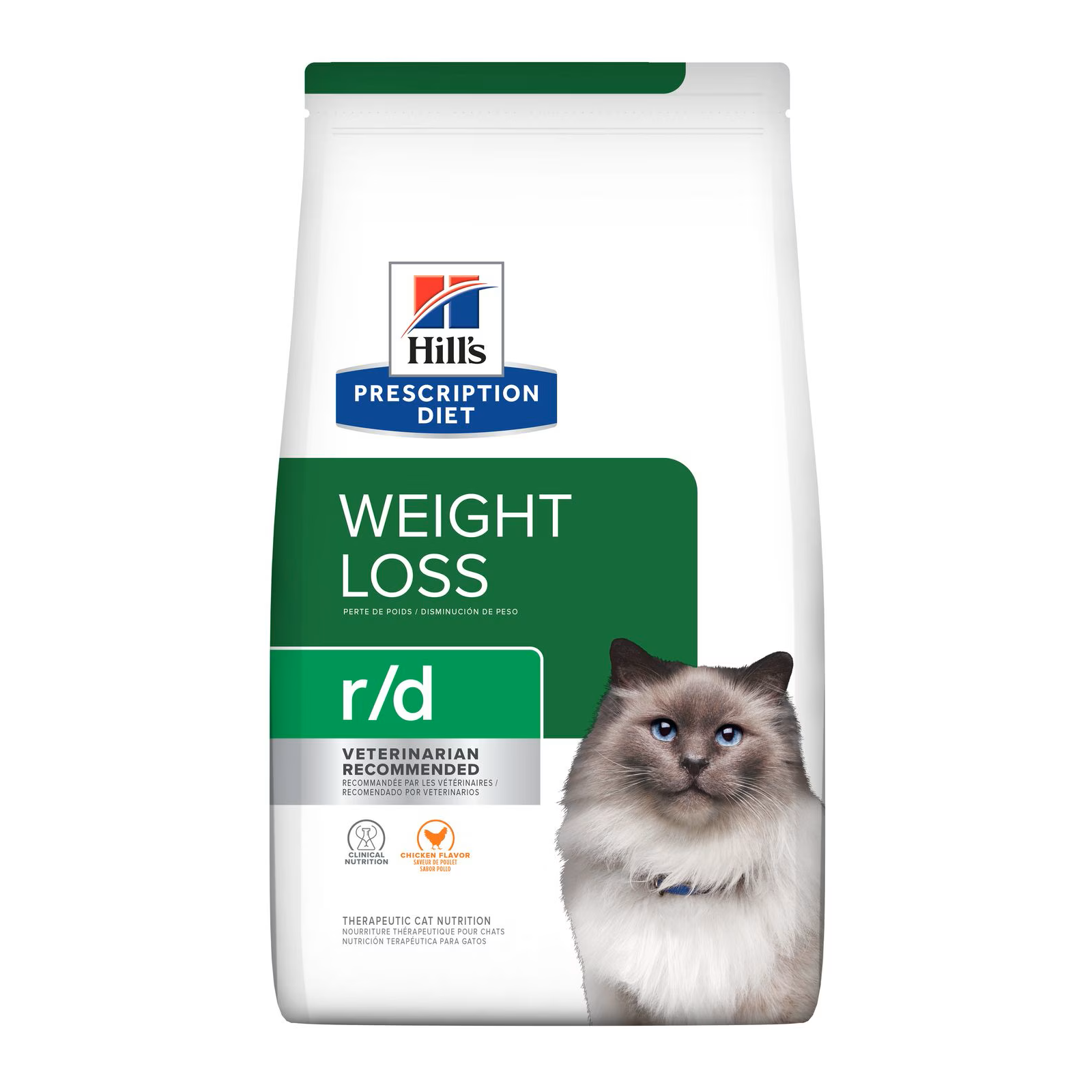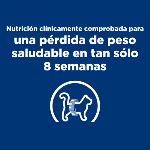 Al igual que la epidemia de obesidad humana, más del 50 % de la población de mascotas tiene sobrepeso. Incluso un poco de peso adicional puede afectar la calidad de vida de las mascotas y la relación con la familia porque ese peso adicional puede reducir el tiempo de juego, afectar la movilidad y afectar la salud general de su gato de por vida. Los nutricionistas y veterinarios de Hill’s desarrollaron la nutrición clínica Prescription Diet r/d especialmente formulada para apoyar la pérdida de peso de los gatos. De hecho, la nutrición r/d está clínicamente probada para una pérdida de peso saludable en solo 4 semanas. Este alimento seco tiene un irresistible sabor a pollo que a los gatos les encanta.