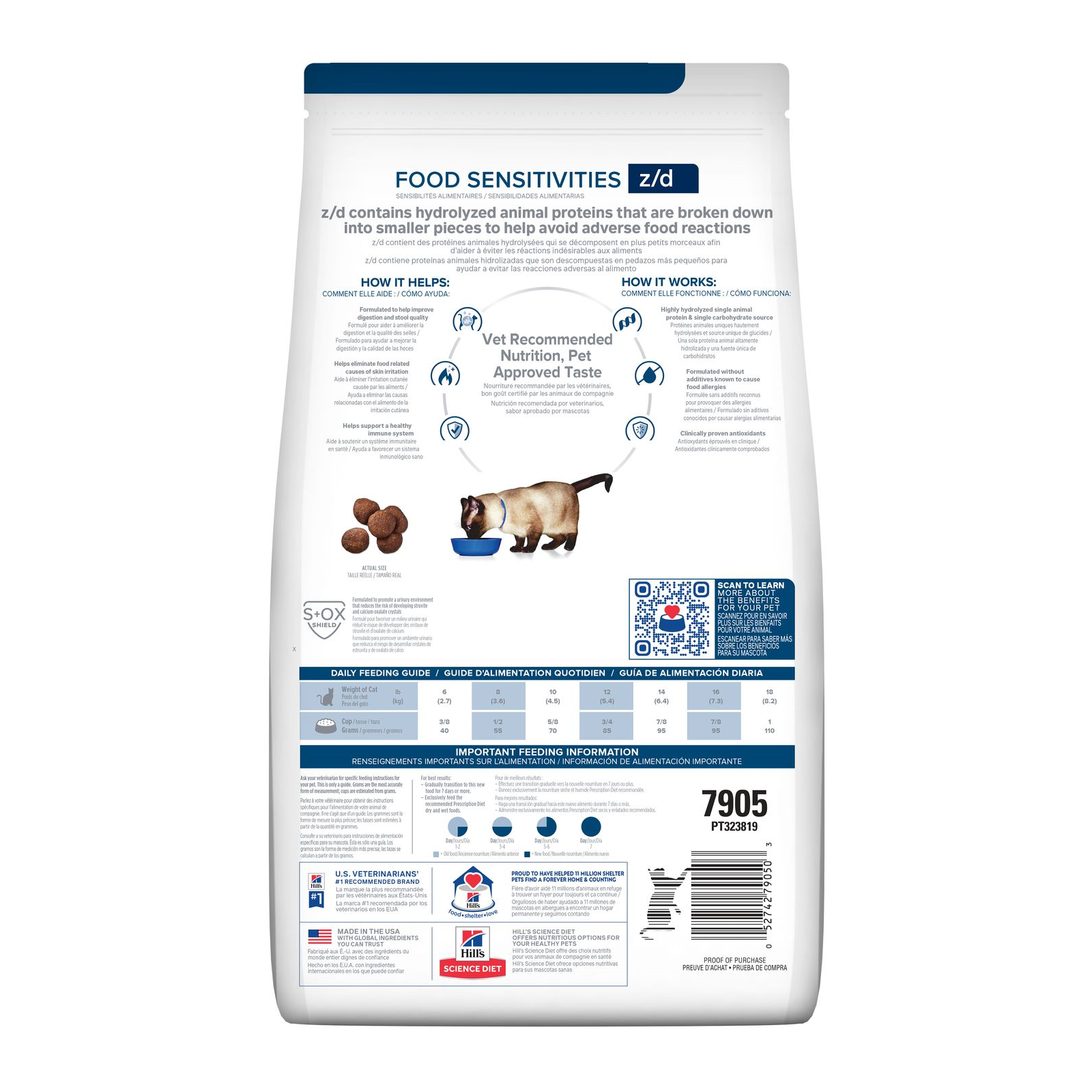 Hill’s Prescription Diet z/d esta especialmente formulada para dar apoyo a las sensibilidades cutáneas y al alimento de su gato. Las sensibilidades e intolerancia al alimento son problemas potencialmente serios que pueden resultar en piel irritada, condiciones de pelaje y orejas e inclusive trastornos gastrointestinales. Los gatos que tienen una sensibilidad o intolerancia al alimento, llamadas también reacciones adversas al alimento, por lo general experimentan una respuesta anormal a la proteína del alimento.