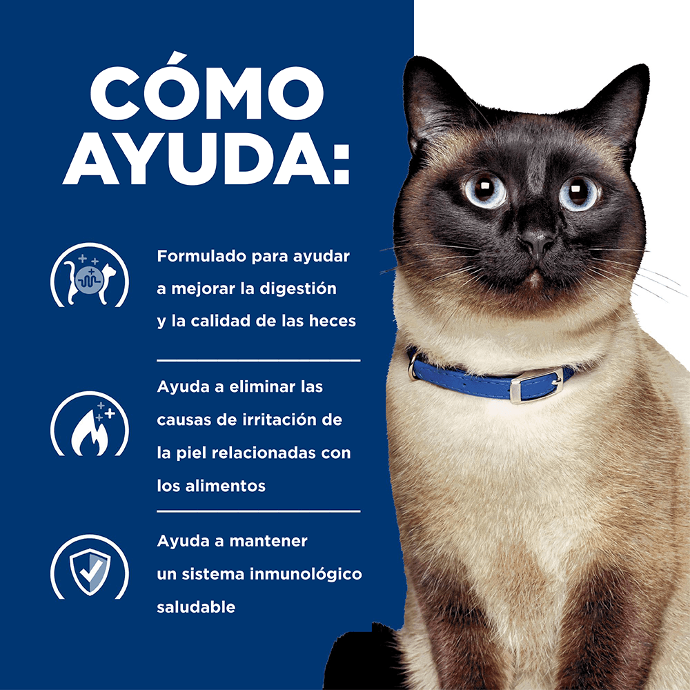 Hill’s Prescription Diet z/d Nutrición clínicamente probada con proteína hidrolizada para ayudar a evitar reacciones alimentarias adversas en gatos y promueve una piel saludable.