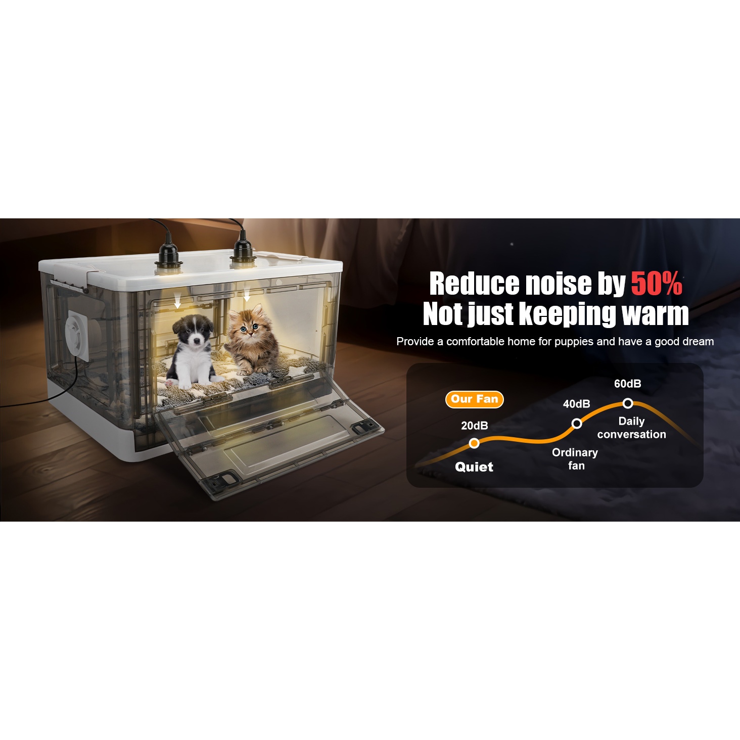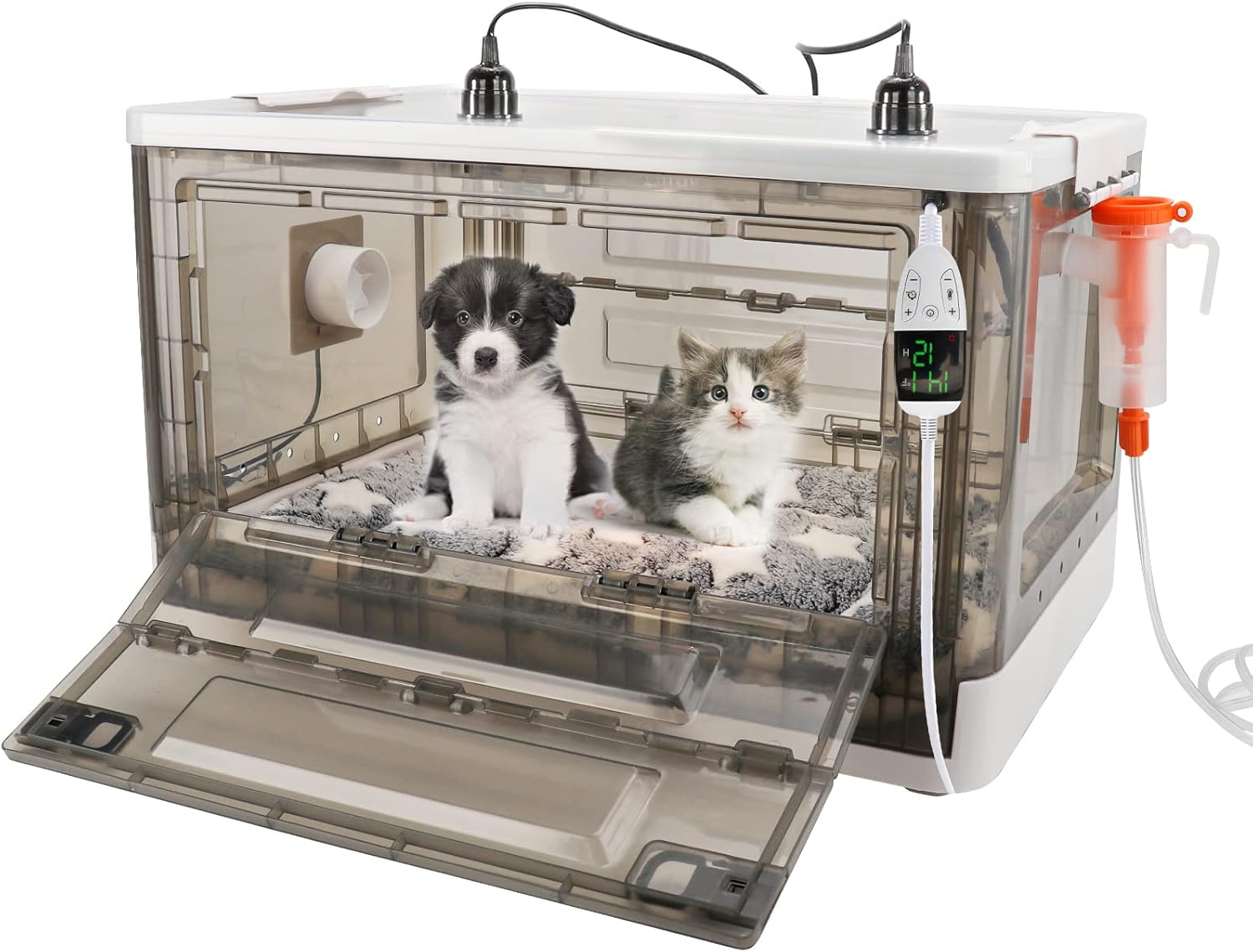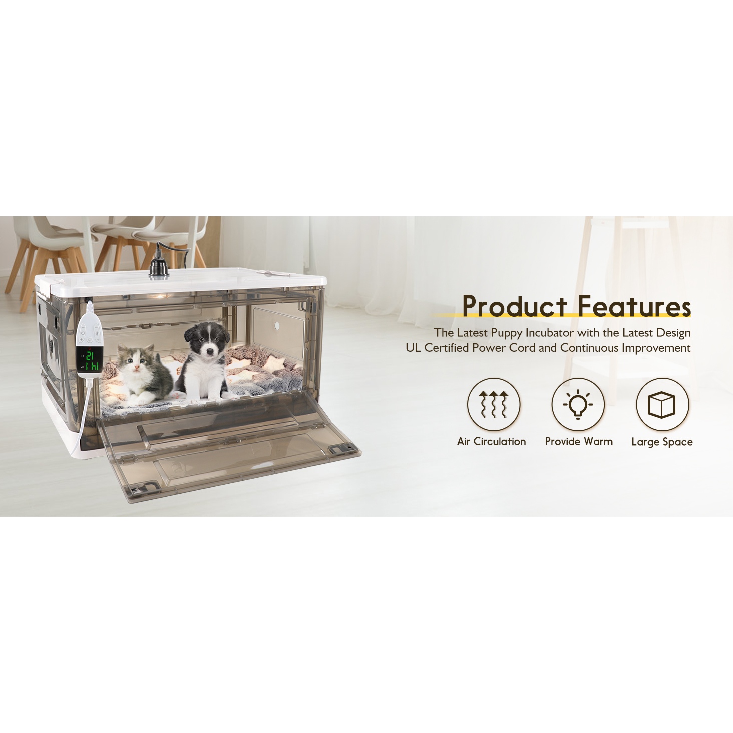 La mejor incubadora de cachorros pone a tus cachorros, gatitos, equipado con detección de temperatura y humedad, es conveniente observar directamente la temperatura y la humedad en la caja. (Añadir diseño de lámpara solar de preservación de calor)
