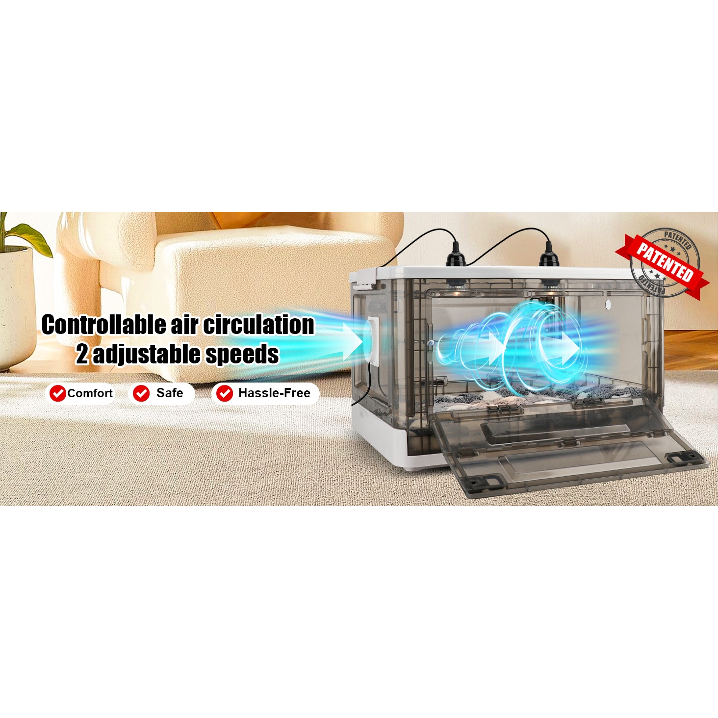 Último diseño, se añade un ventilador que puede ajustar la velocidad del viento al costado de la incubadora de cachorros para mantener la circulación de aire controlable de la incubadora de cachorros. La lámpara solar de preservación del calor está diseñada con un botón que puede ajustar el tamaño de la luz, y puedes elegir libremente la temperatura adecuada para tus cachorros.