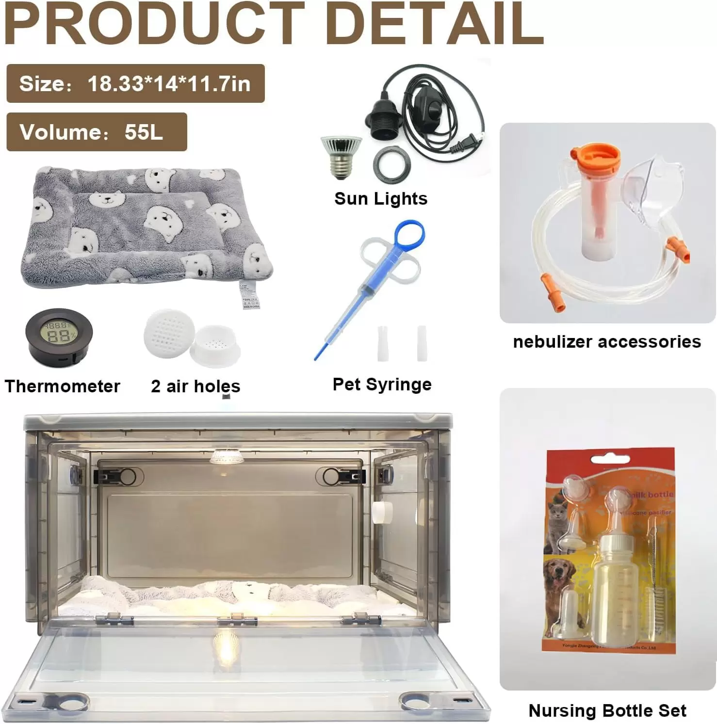 Esta incubadora viene con una almohadilla de felpa, una lámpara de calor solar, un termómetro, un orificio de aire, accesorios para nebulizador, un juego de biberones y una jeringa para mascotas para ayudar a mantener un ambiente saludable e higiénico para sus cachorros.