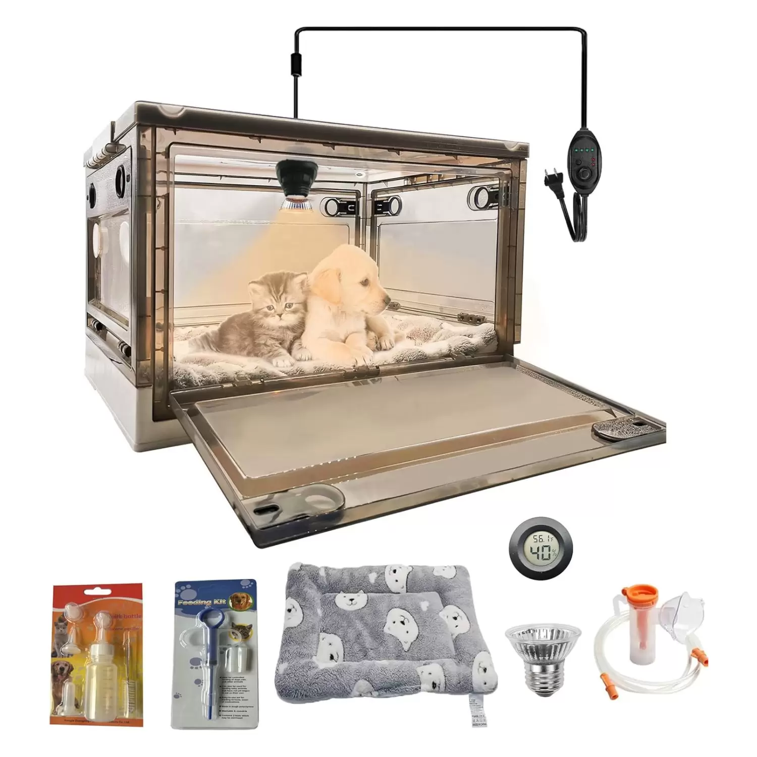 Incubadora con calefacción para cachorros y gatitos, ideal para criadores y veterinarios. Incluye un completo kit de crianza para el cuidado y alimentación de recién nacidos.