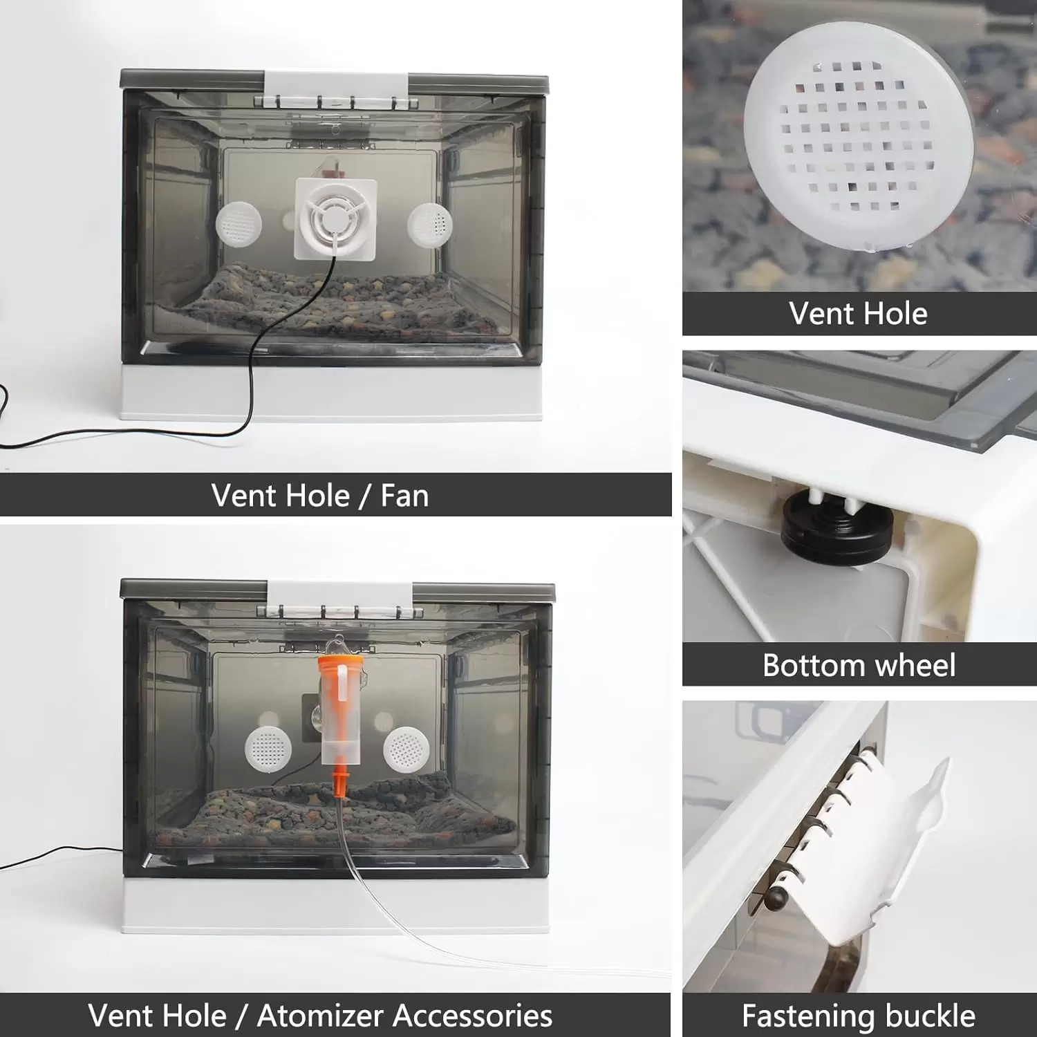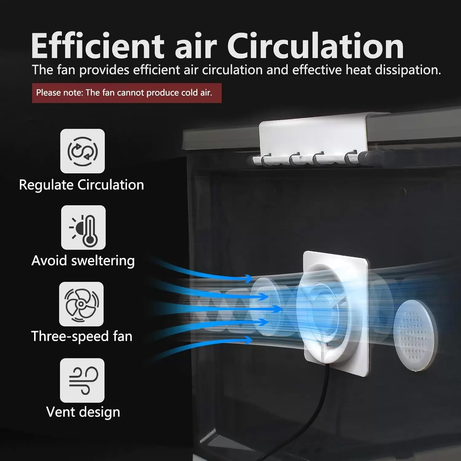 Circulación de aire: El ventilador de circulación ajustable de tres velocidades inyecta aire fresco en la incubadora, asegurando un amplio suministro de aire dentro de la incubadora de cachorros. Junto con cuatro orificios de ventilación en los lados, hace circular aire fresco para evitar el sobrecalentamiento o la ranciedad.