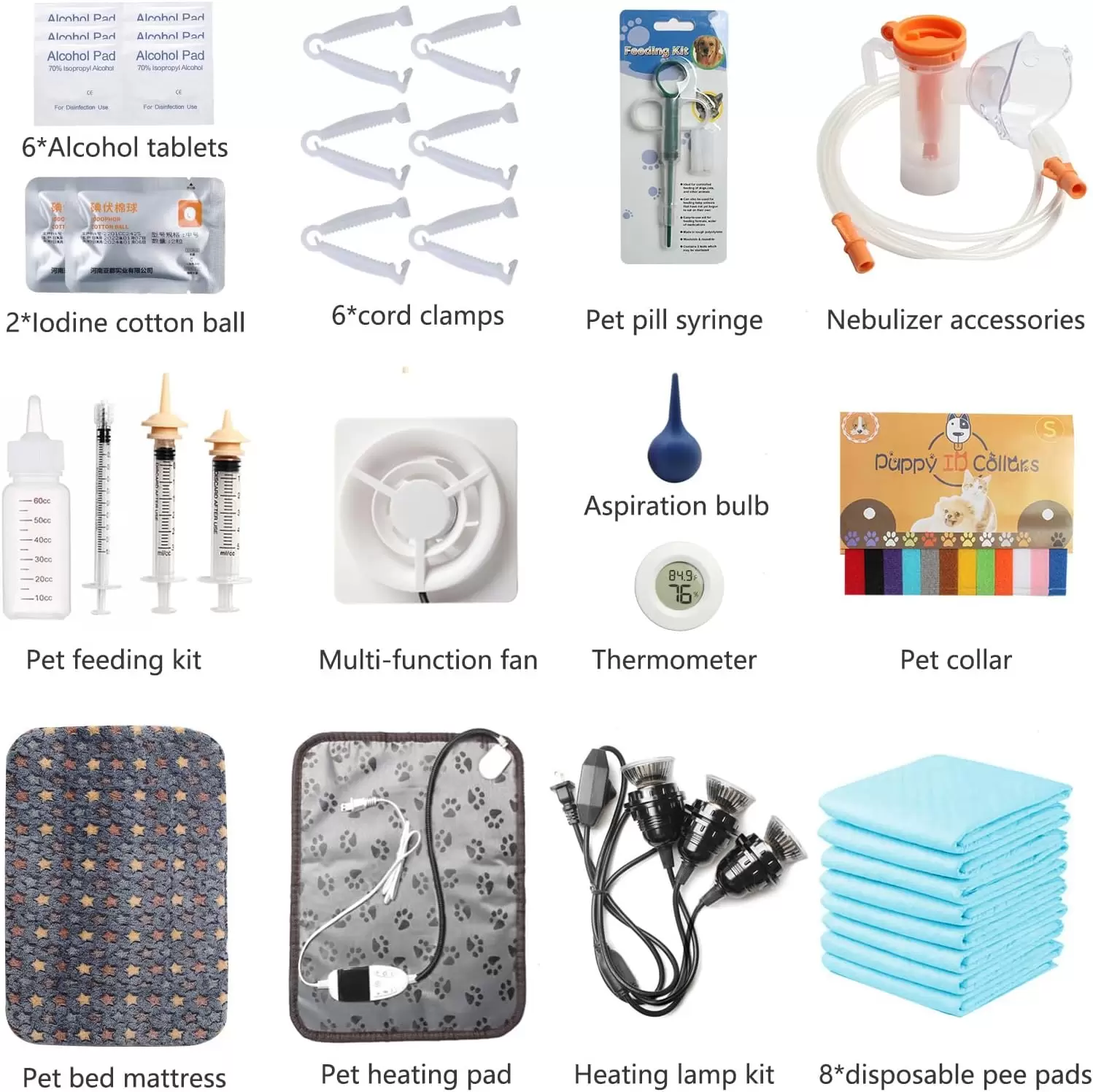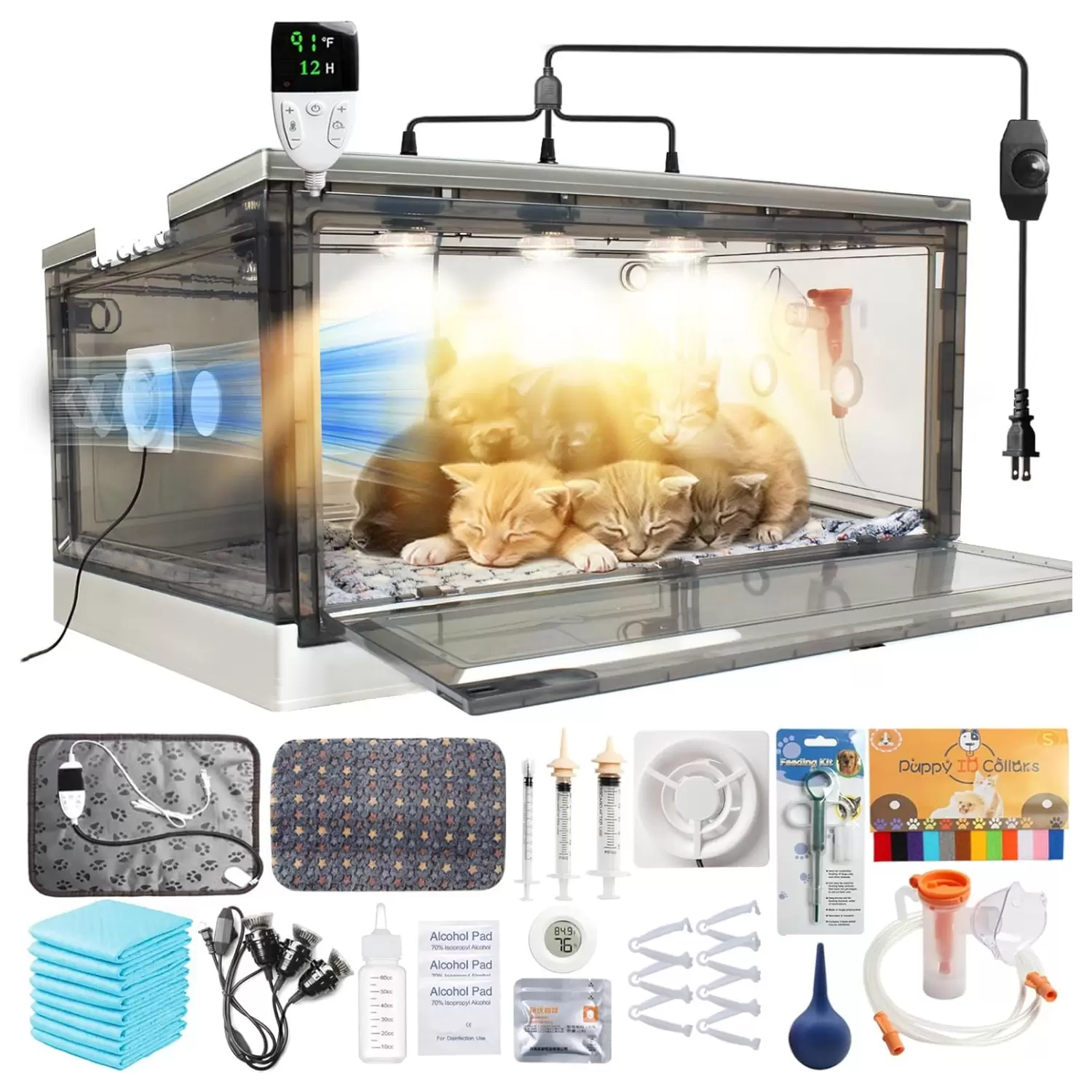 Lo que obtienes: 1 incubadora para mascotas, 1 ventilador, 1 alfombrilla de calefacción, 1 alfombrilla de cama para mascotas, 1 higrómetro de temperatura (baterías no incluidas), 2 lámparas de calor, 1 luz de perilla de control, 1 accesorio para nebulizador. 1 juego de kit de parto para cachorros: (incluye 2 chupetes cortos, 1 0.1 fl oz, jeringas de 0.2 fl oz, 1 botella para mascotas, 1 tableta de cápsula). Pill pusher, 1 2 collares, 6 toallitas con alcohol, 2 bolas de algodón de yodo, 8 almohadillas desechables para orinar para mascotas, 1 bombilla de succión, 6 abrazaderas) guía de bienvenida y nuestro amable servicio al cliente.
