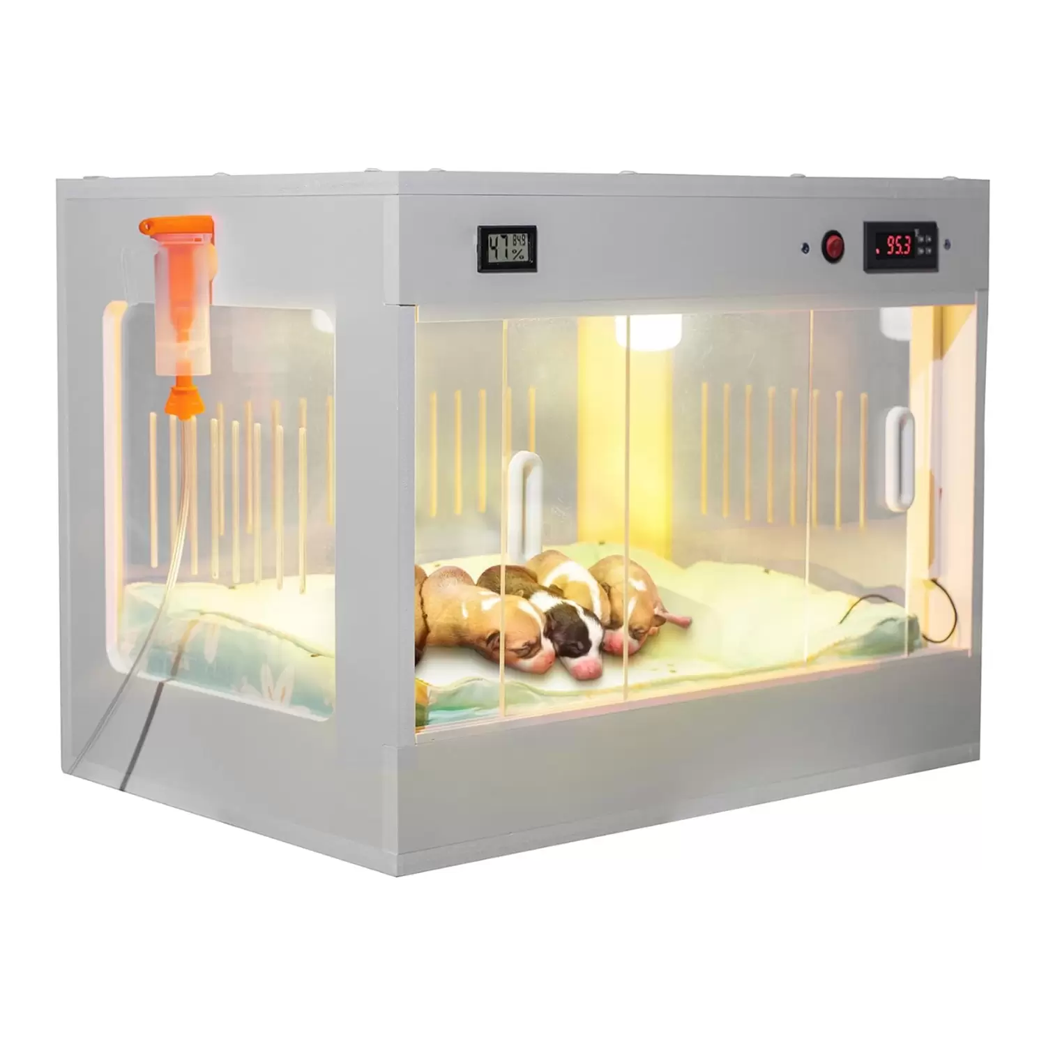 Incubadora neonatal inteligente para cachorros y gatitos. Controla automáticamente la temperatura y humedad, ideal para criadores, veterinarios y uso doméstico con accesorios.